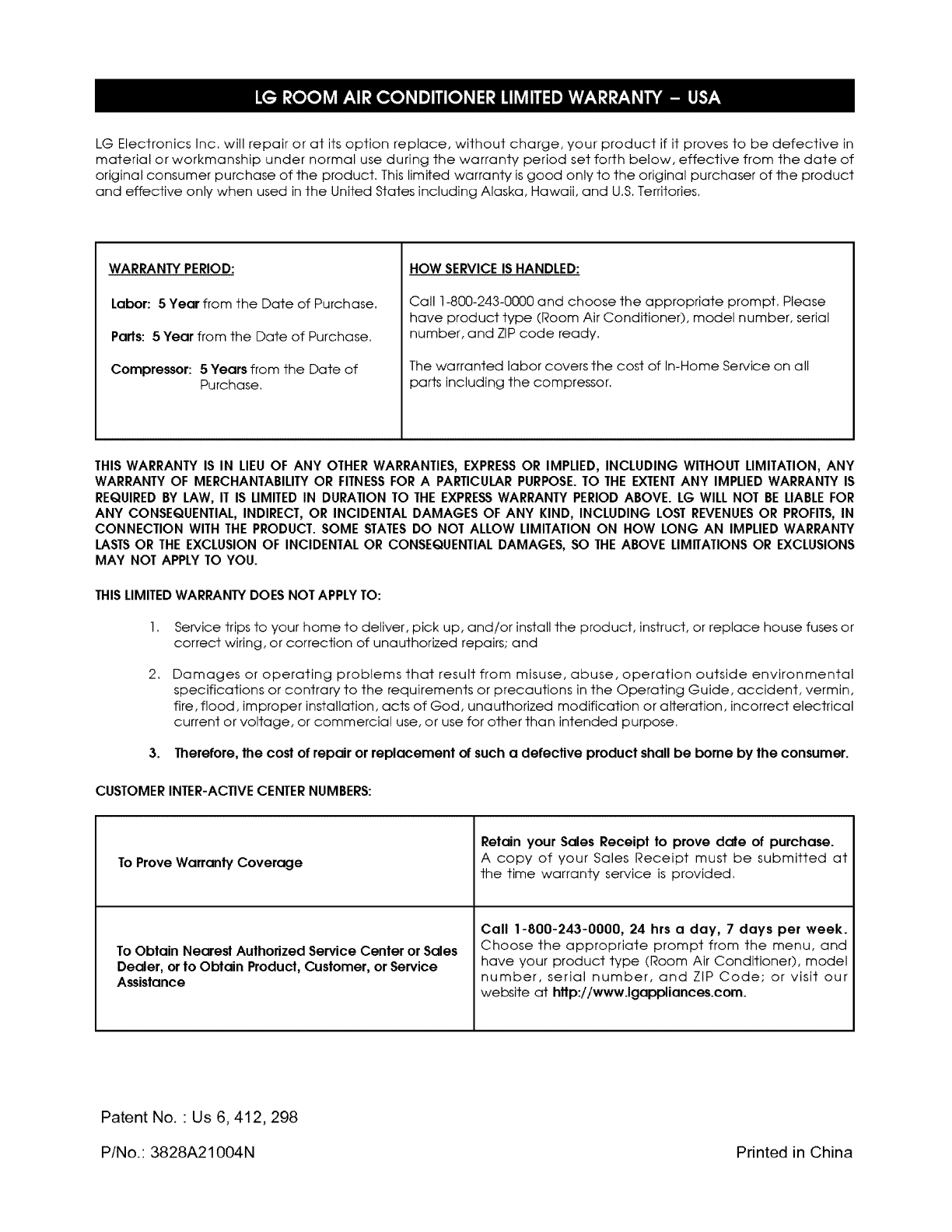 LG Electronics Inc, will repair or at its option replace, without charge, your product if it proves to be defective in