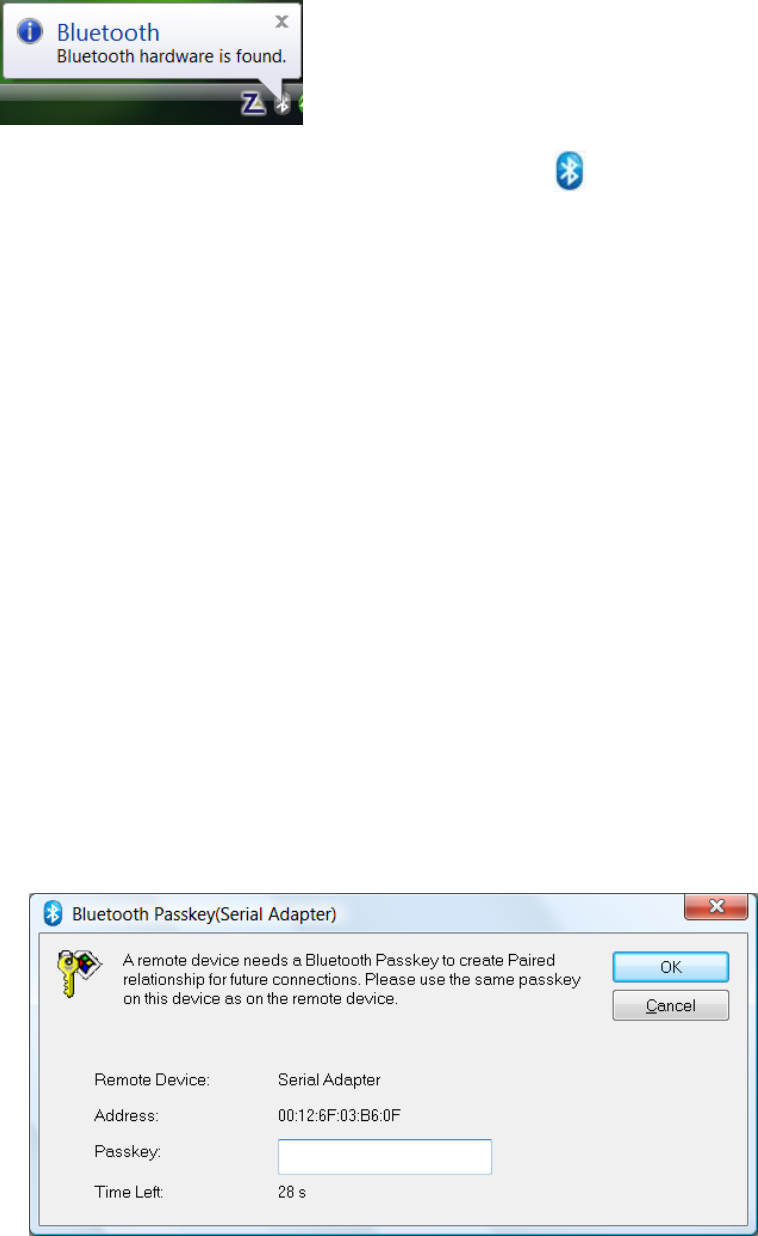 When BlueSoleil starts and the LM540 is plugged in the PC, a notification message will appear