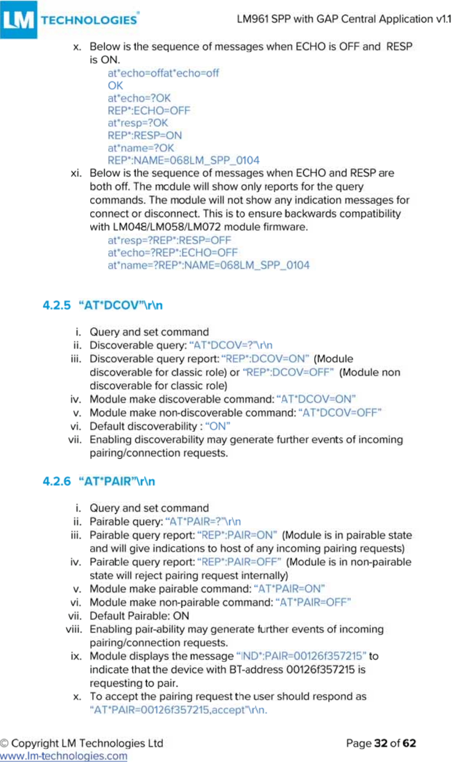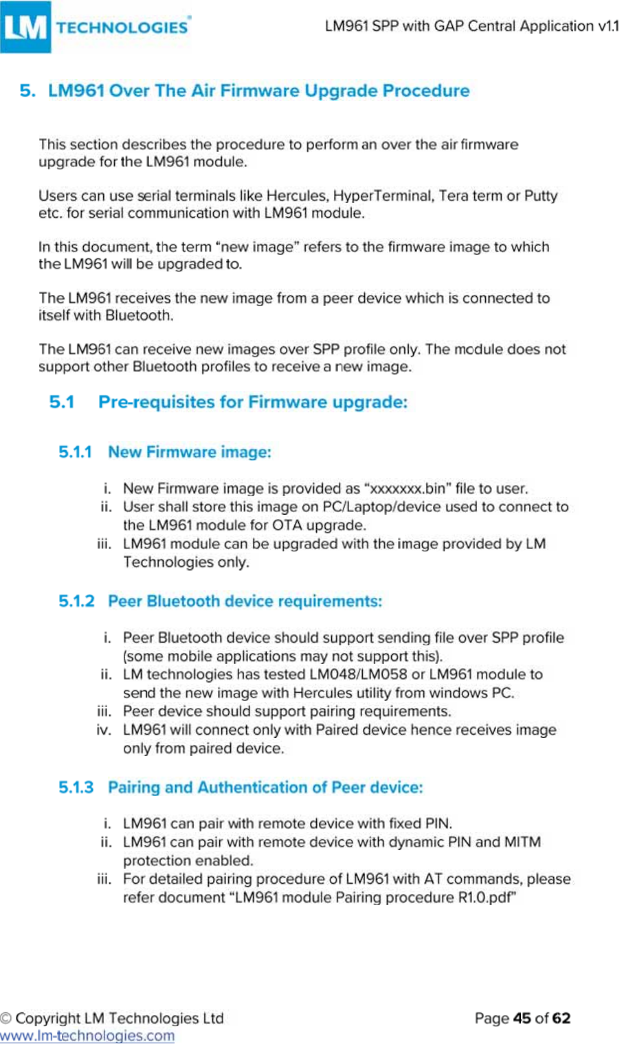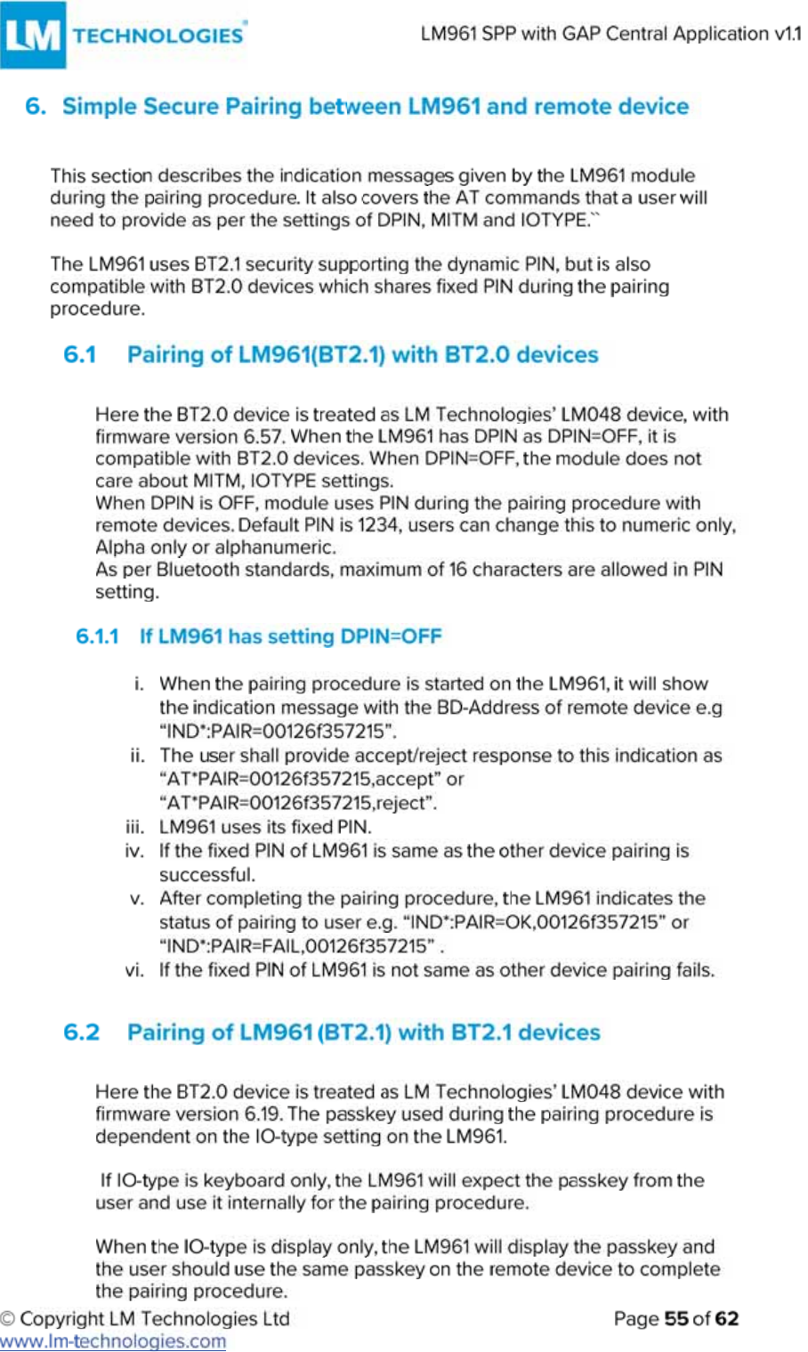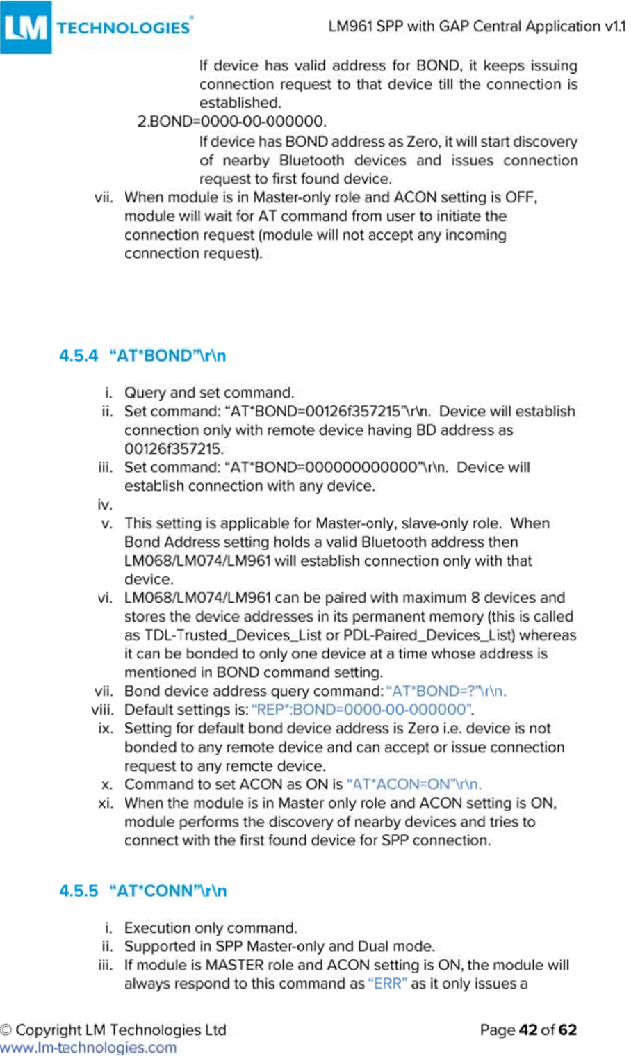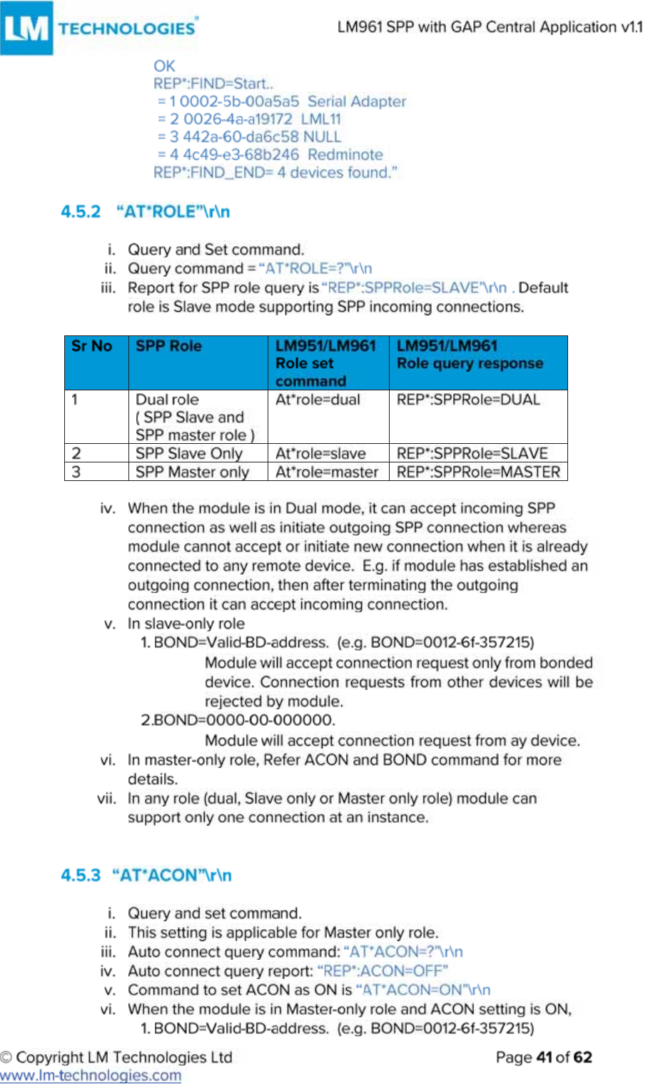 LM Technologies LM961 LM961 Bluetooth v4.1 Dual Mode Module User Manual