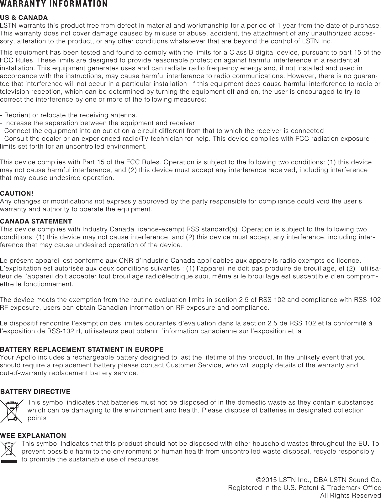 LSTN, INC. Bluetooth Speaker Apollo Quick Start Warranty v1 outlined
