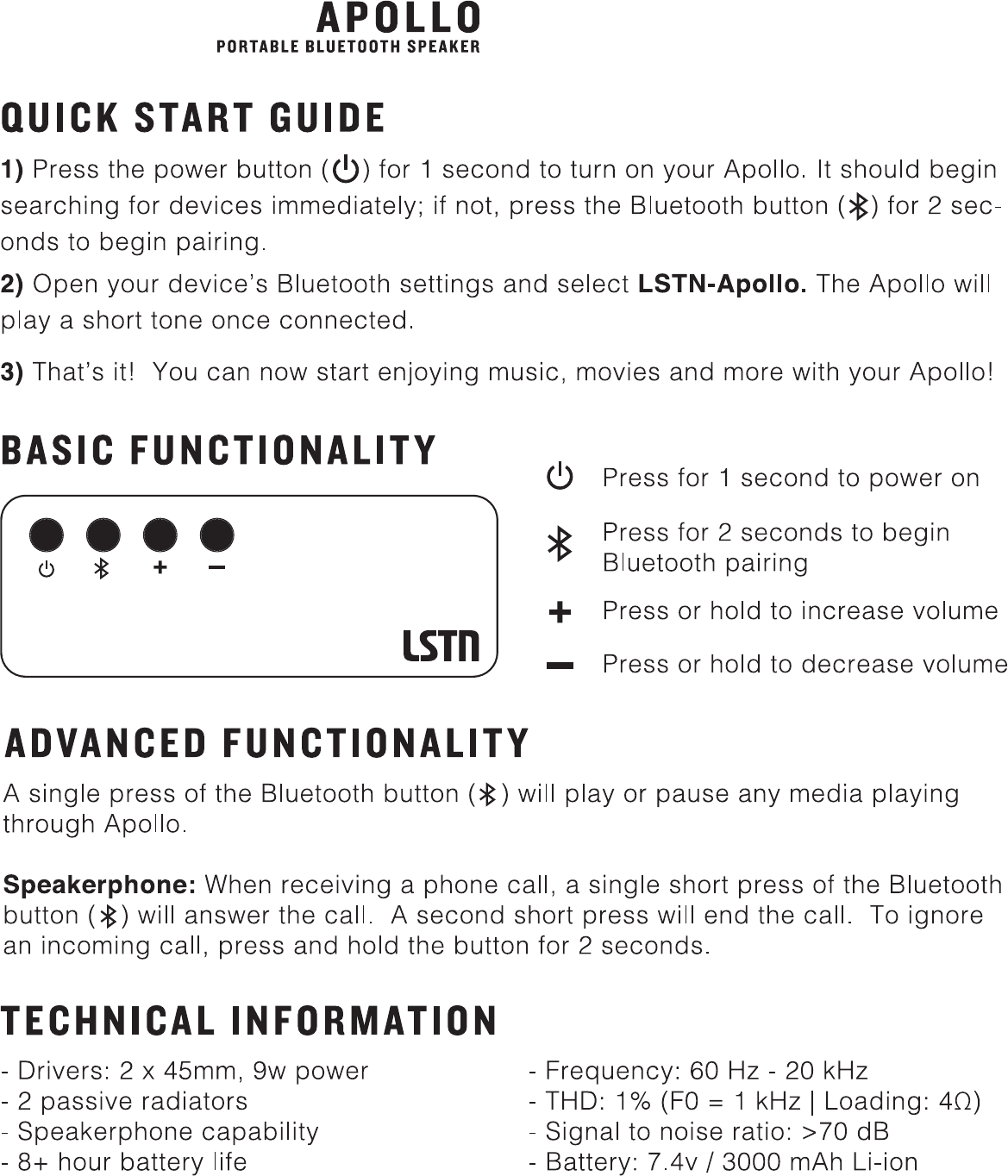 LSTN, INC. Bluetooth Speaker Apollo Quick Start Warranty v1 outlined