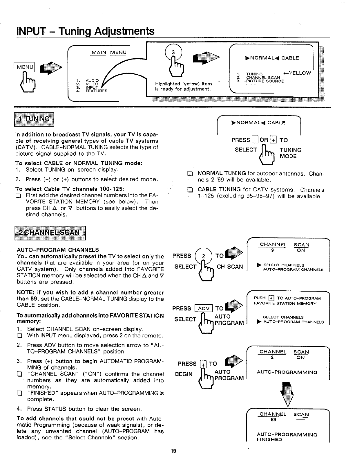 [] Check (3. INPUT-TUNING) on-screen display for correct CABLE-NORMAL tun-