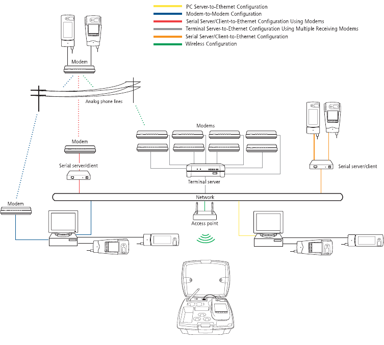 between a meter and the workstation through analog phone lines using modems; through