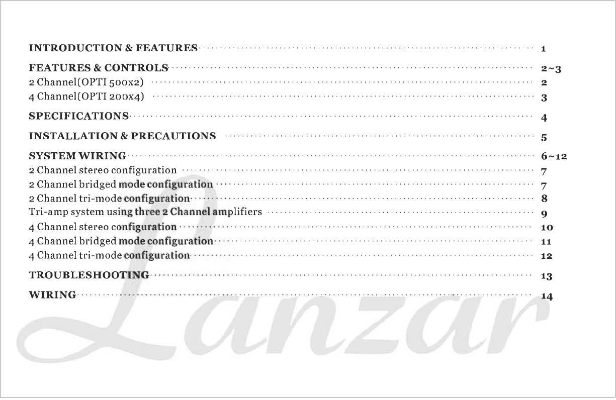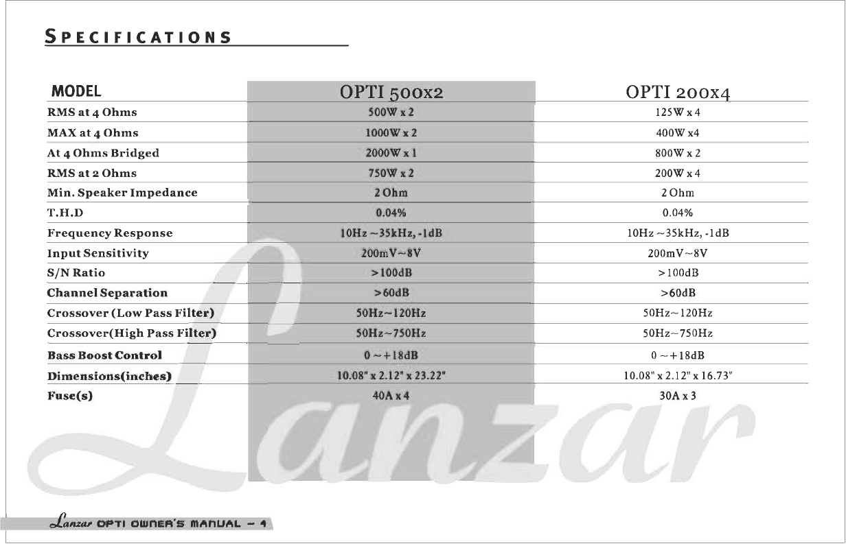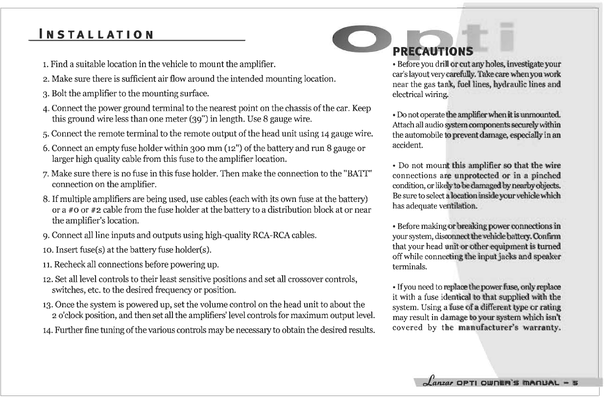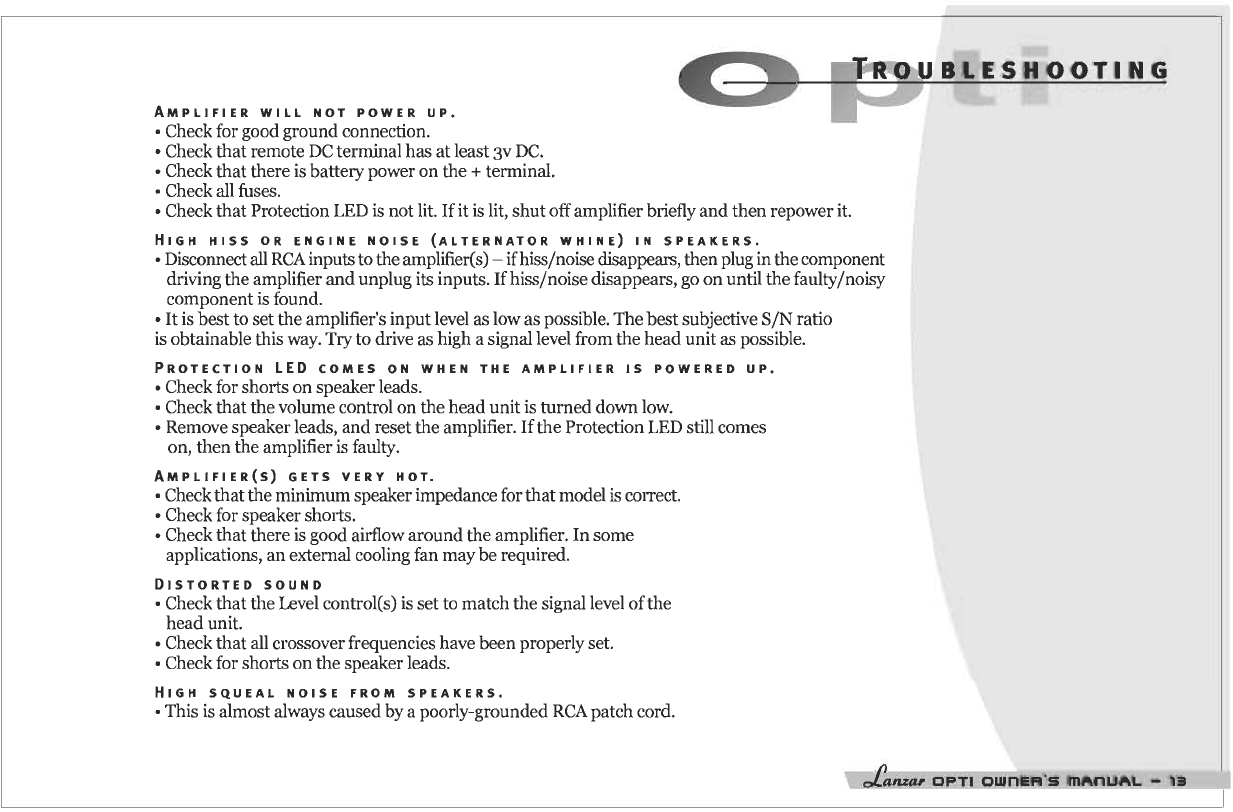 Lanzar OPTI Drive OPTI200X4 Amplifier User’s Manual OPTI500X2-200X4 Troubleshoot Lanzar OPTI Drive OPTI200X4 Amplifier |