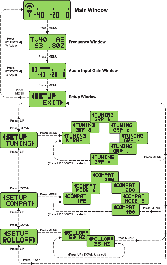 In TUNE mode, the Up and Down buttons may be used to select a new fre-