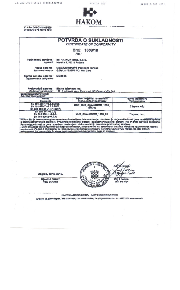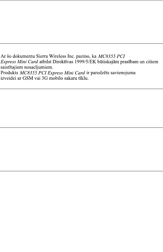 SierraWirelessInc.,pareiškia,kadMC8355PCIExpressMiniCardatitinka