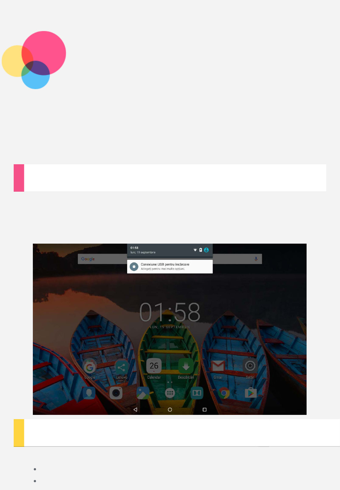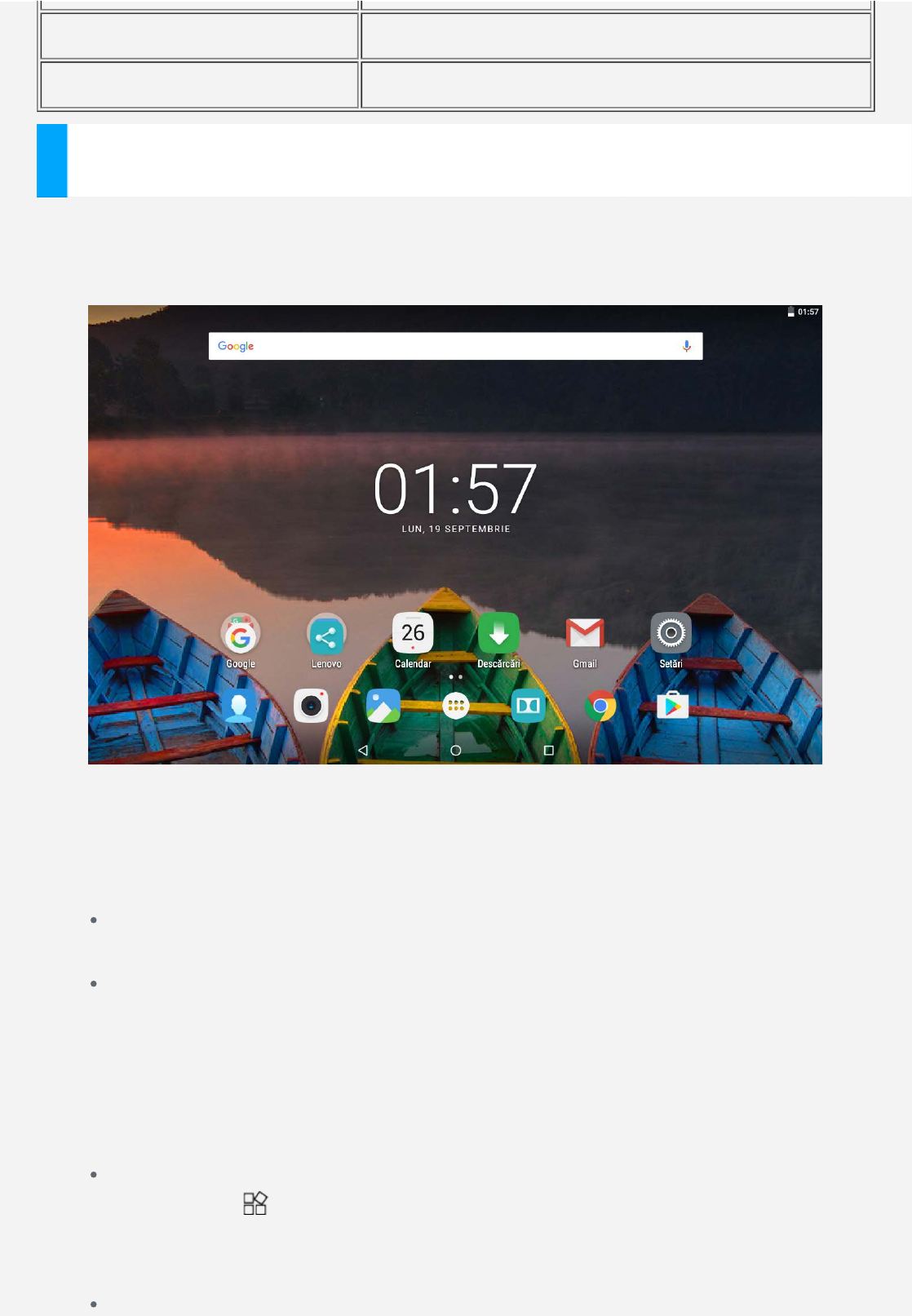 Notă: Funcţiile dispozitivului şi ecranul de pornire pot să difere în funcţie de