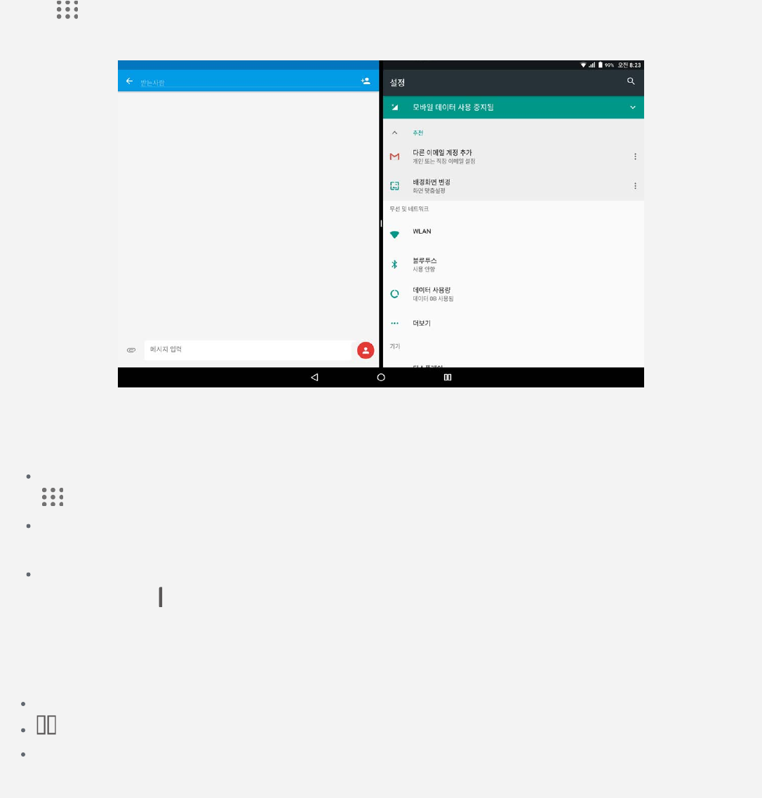 최근 버튼: 을 탭하면 최근 앱이 표시되고 다음 작업을 수행할 수 있습니다.