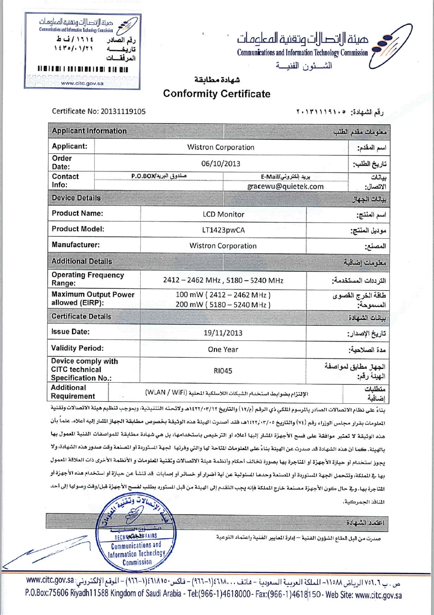 LT1423pwCA Monitor -  (FCC ID: PU5LT1423PWCA)