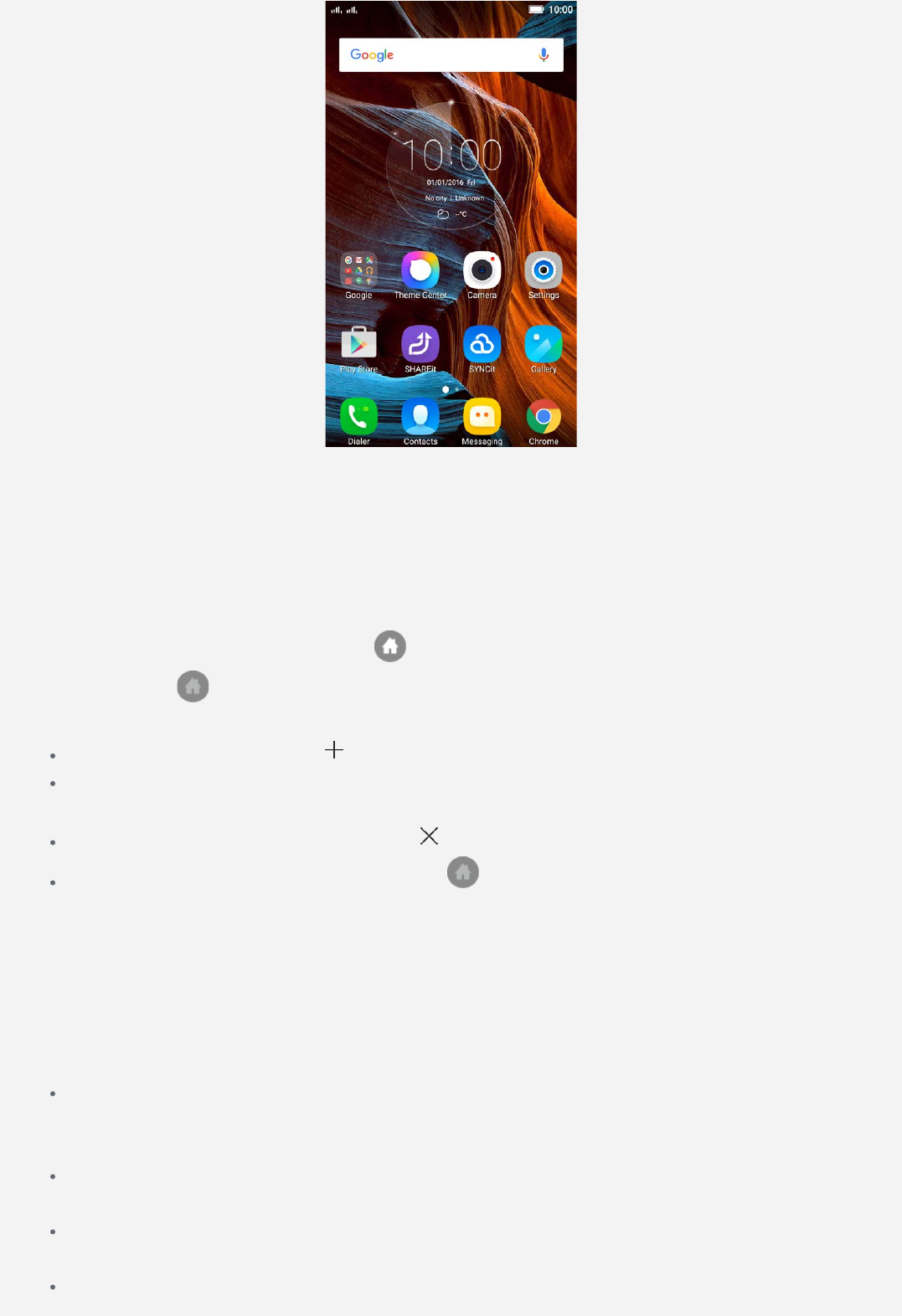 Home button: Tap to return to the default home screen.