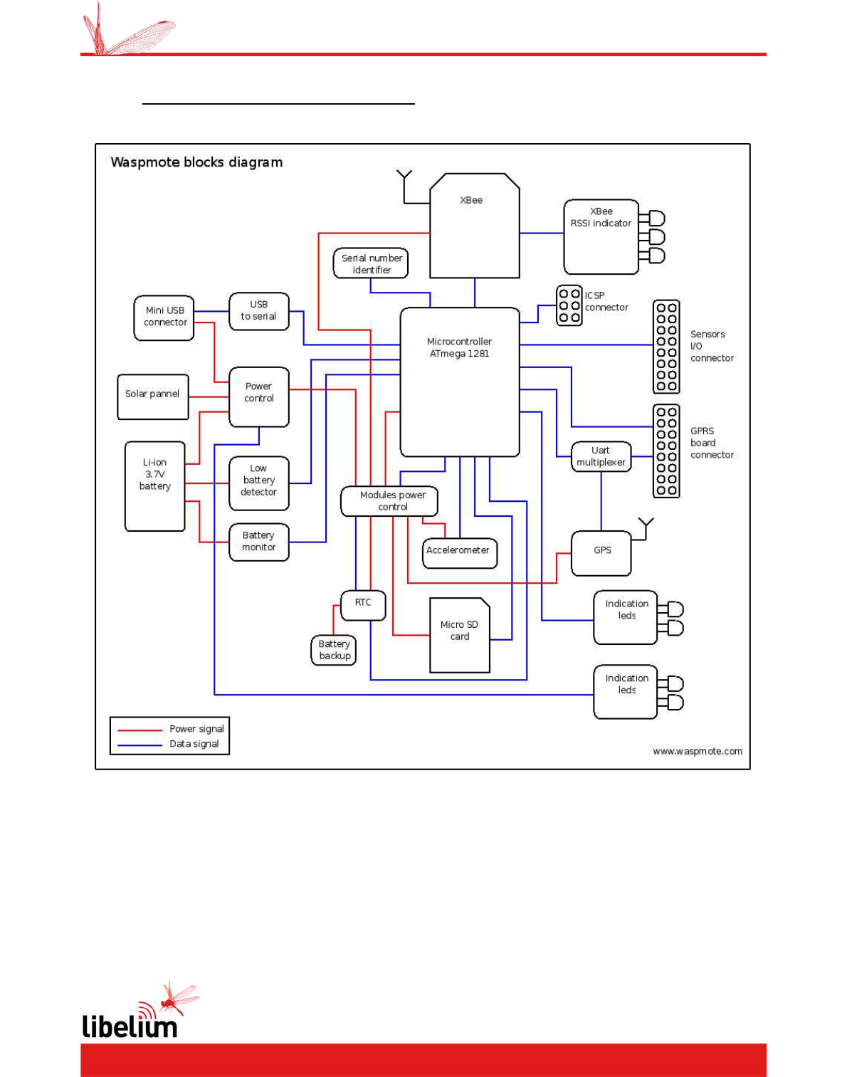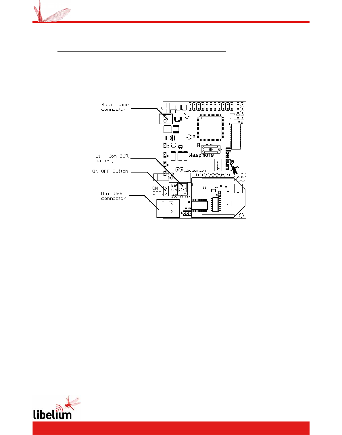 The main power supply for WASP is a Li-Ion battery (3.7V – 1130 mAh). The battery