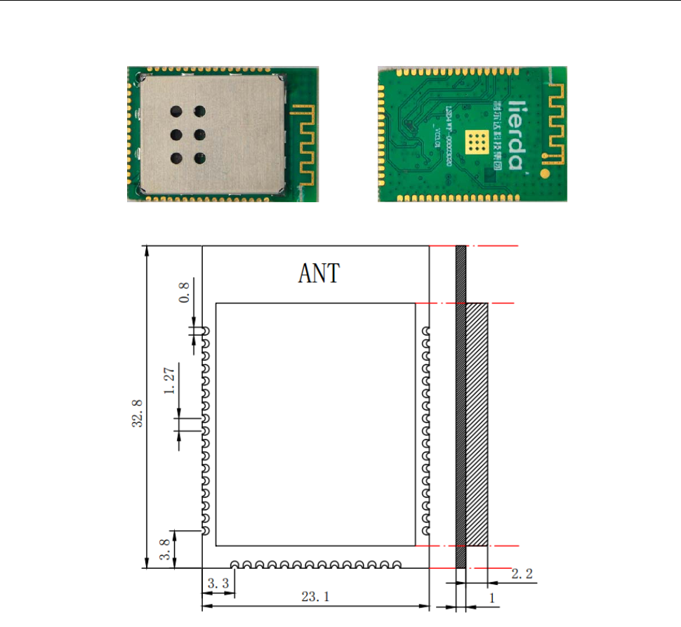 32.8mmx23.1mmx3.2mm, using the stamp hole package, built-in board PCB antenna.