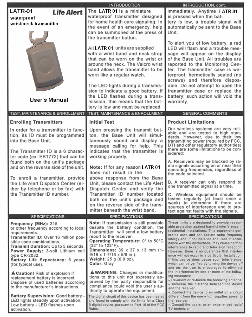 Life Alert Emergency Response 916 Transmitter Pendant User Manual LATR 01 Pendant