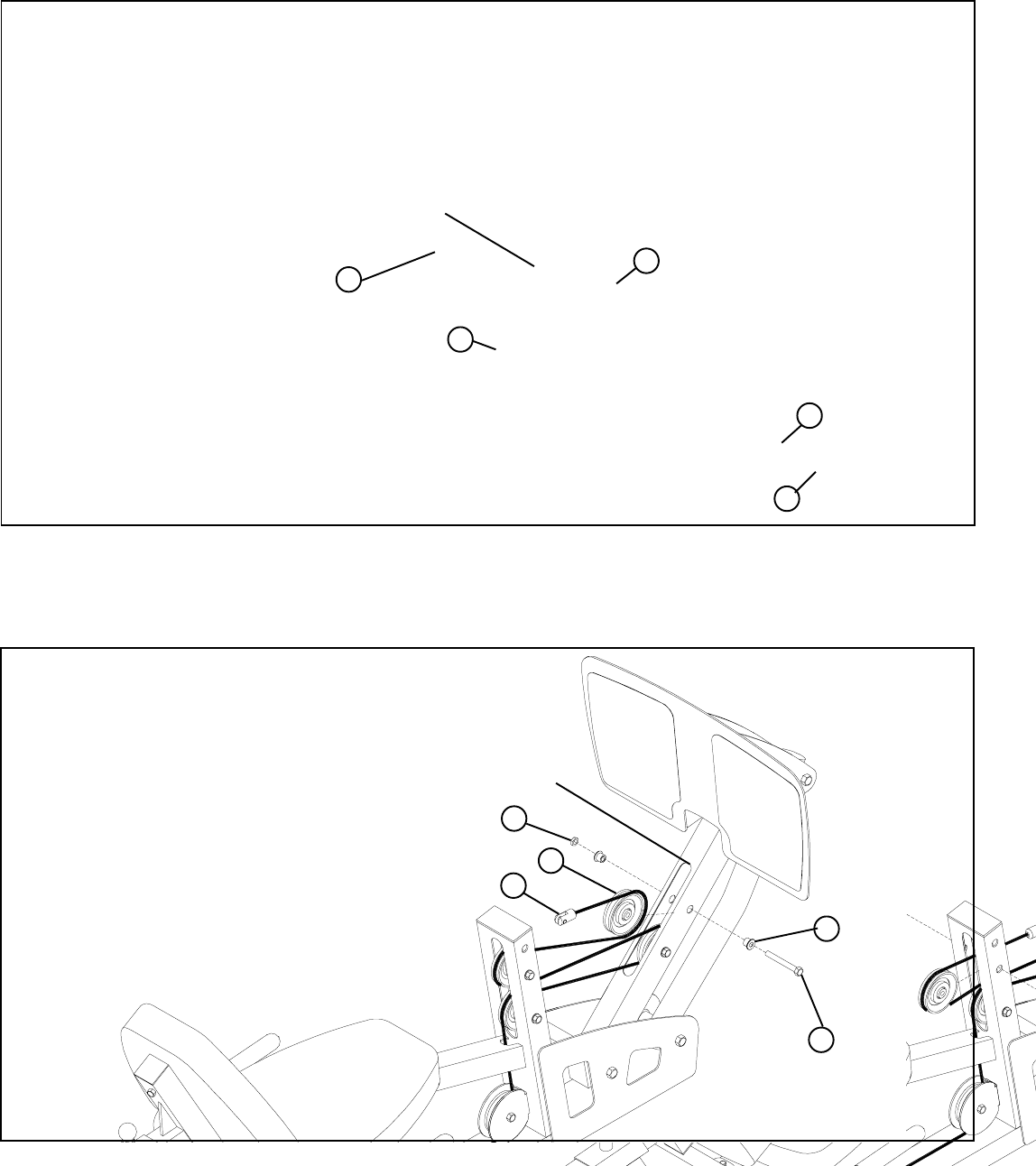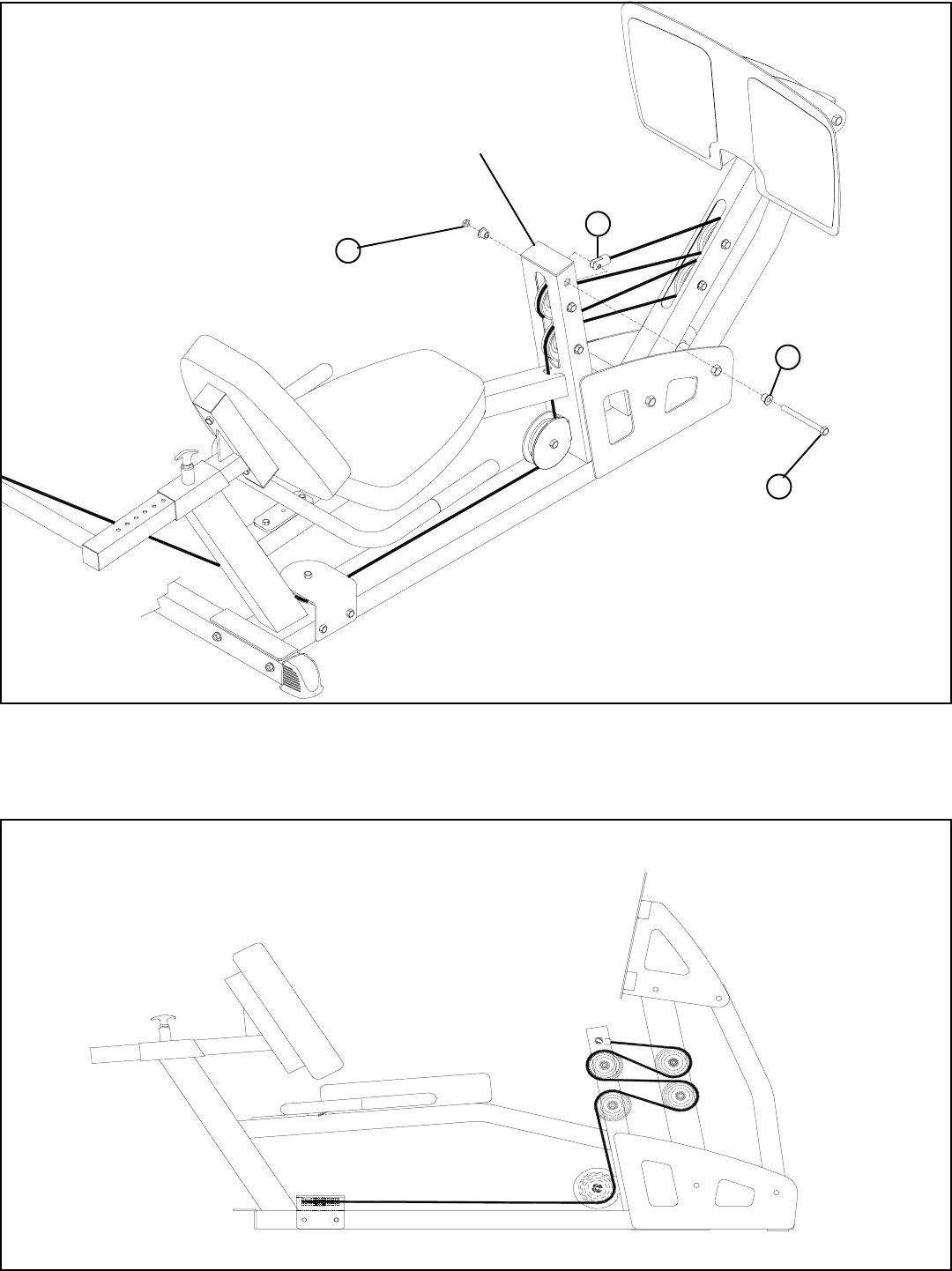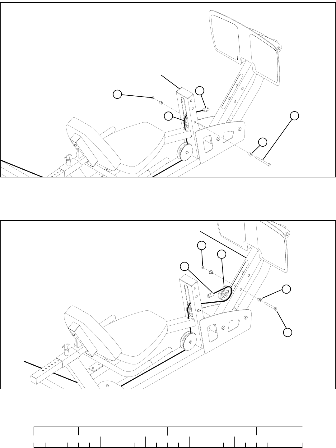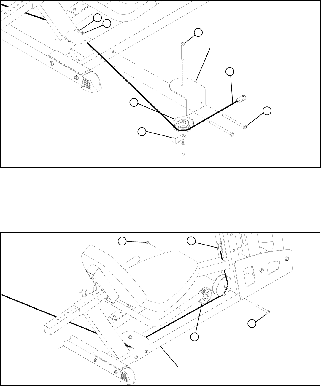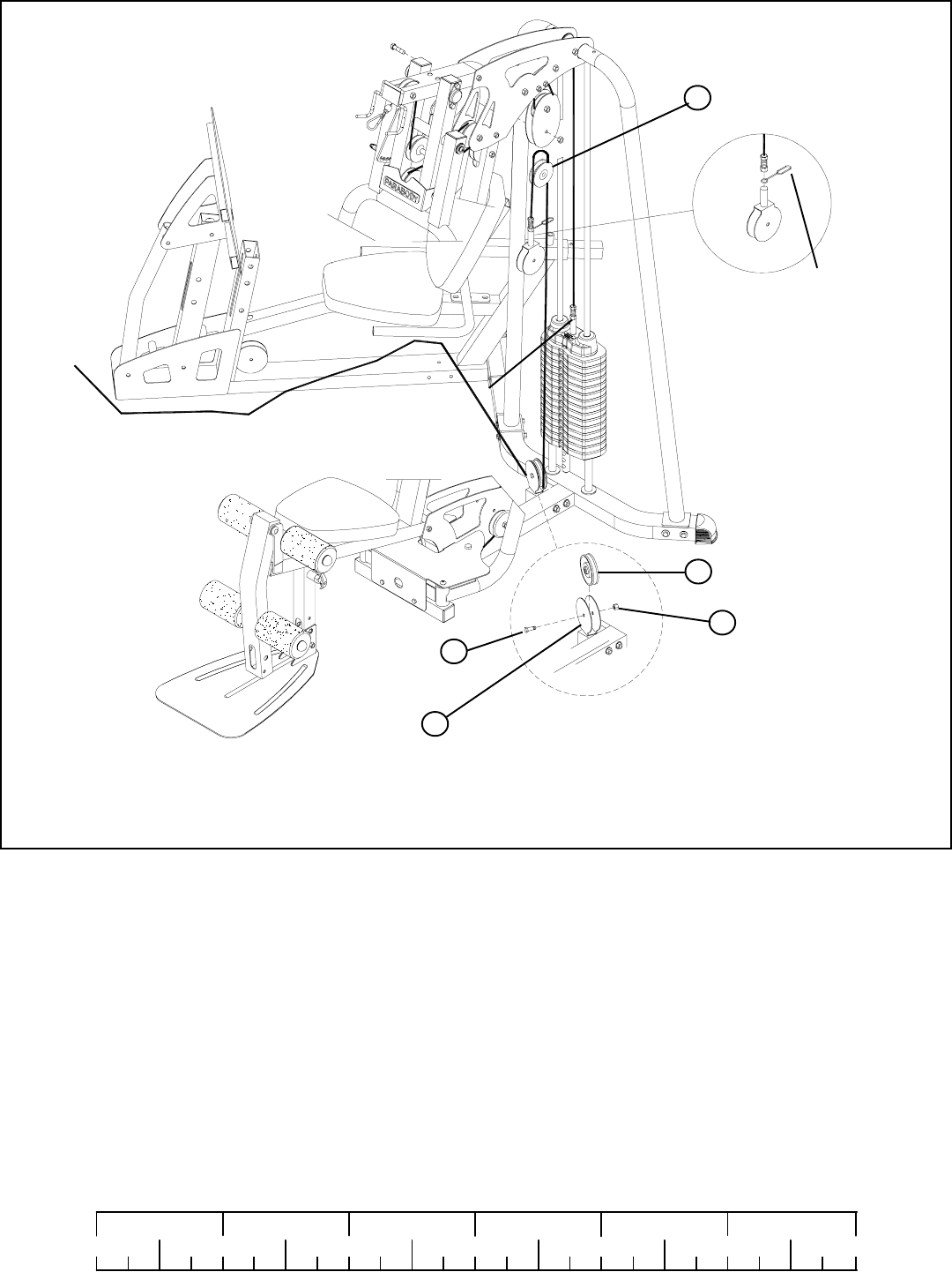 • Carefully route the LEG PRESS CABLE (4) around one 3-1/2” PULLEY (5) and SECURELY assemble the 3-1/2” PULLEY (5) to the SEAT