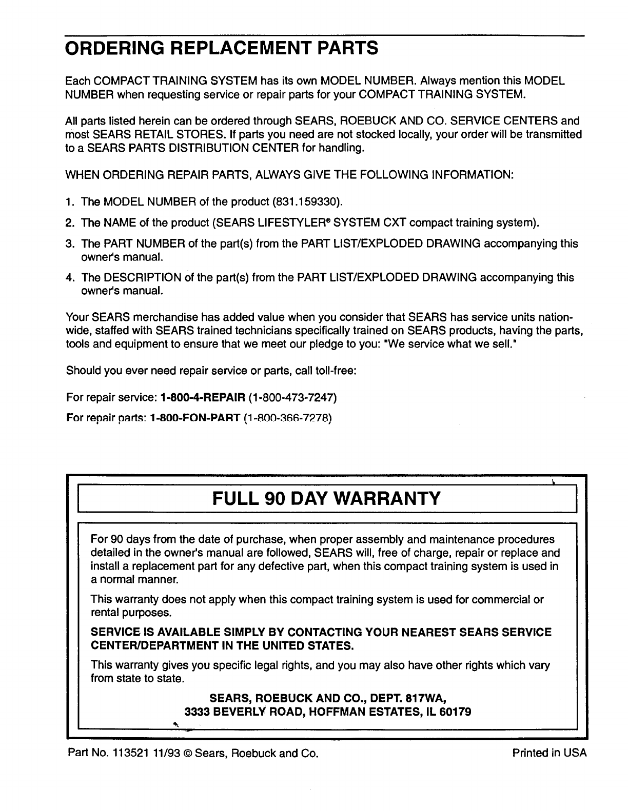 Part No. 113521 11/93 © Sears, Roebuck and Co. Printed in USA