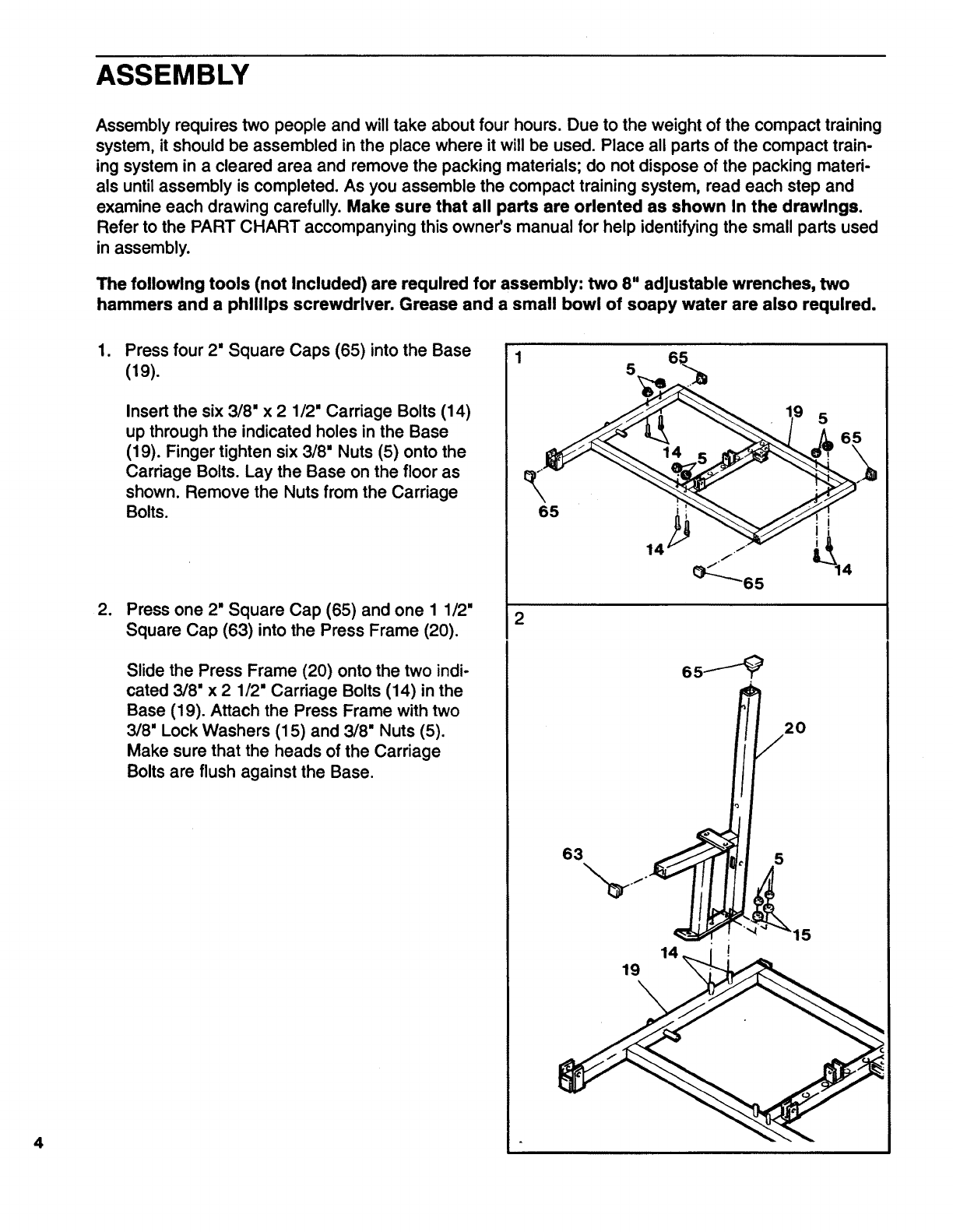 The following tools (not Included) are required for assembly: two 8" adjustable wrenches, two