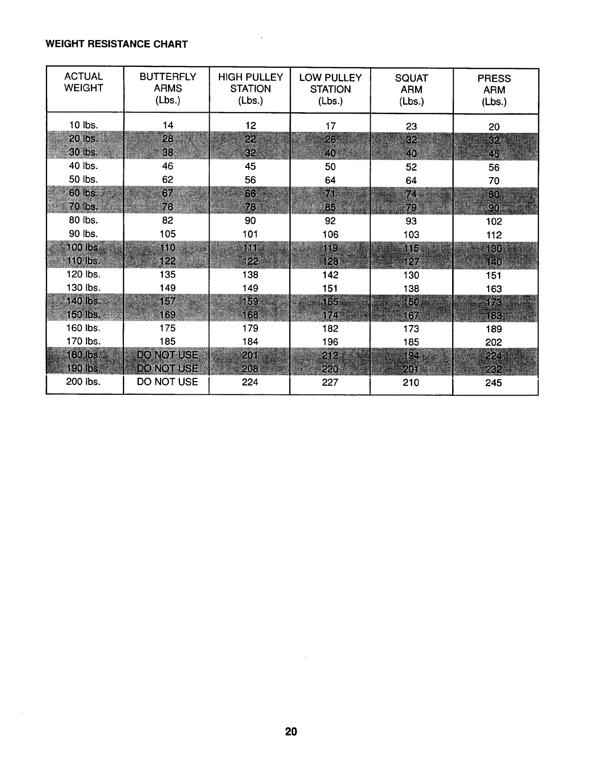 WEIGHT RESISTANCE CHART ........................................................... 20