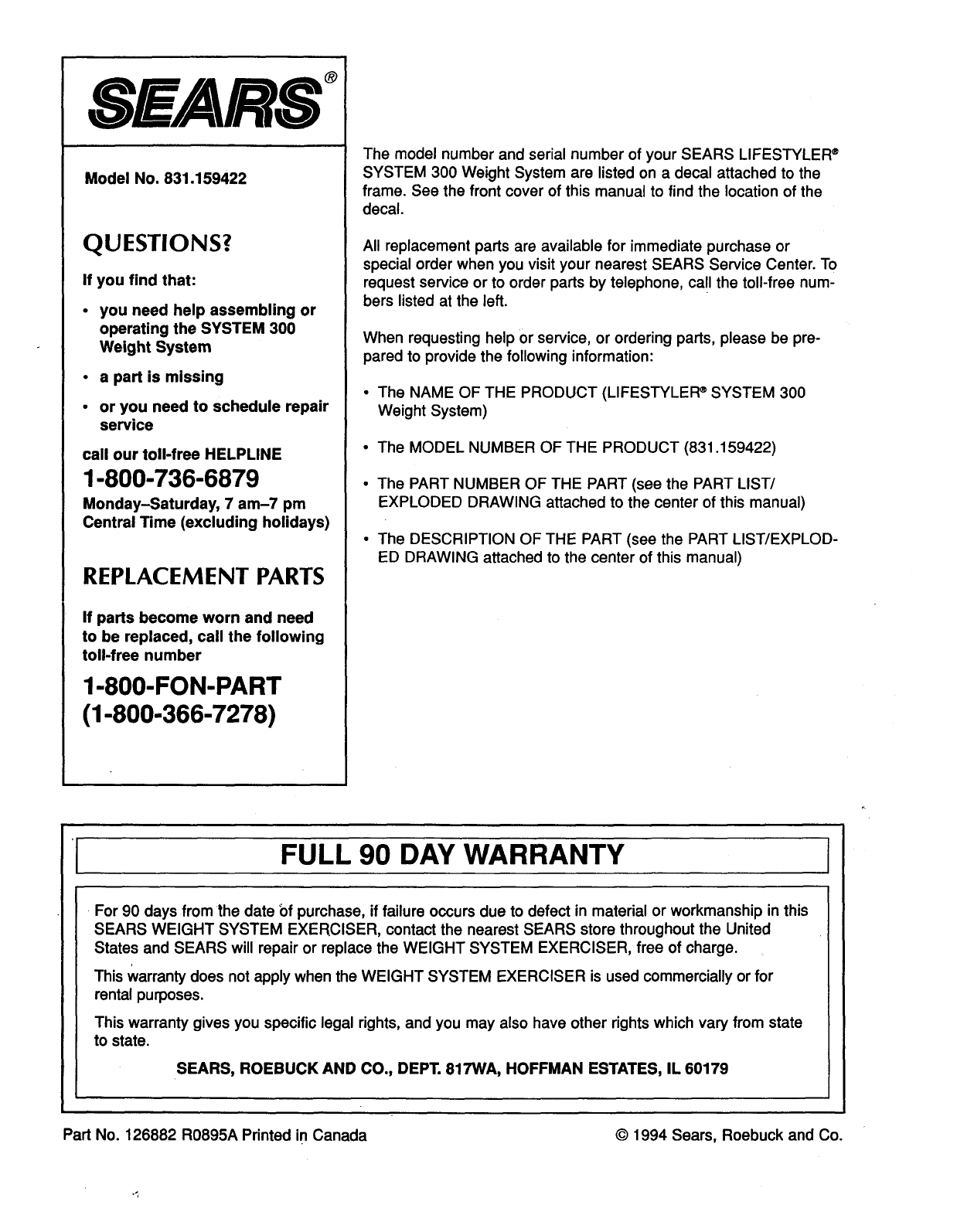 Part No. 126882 R0895A Printed in Canada © 1994 Sears, Roebuck and Co.