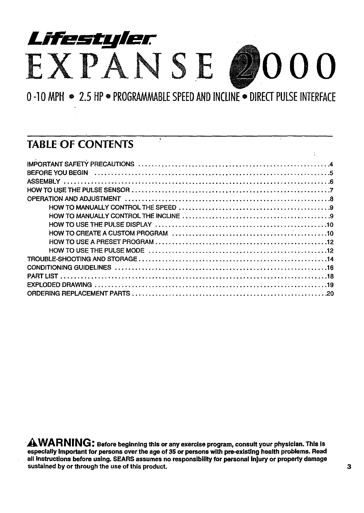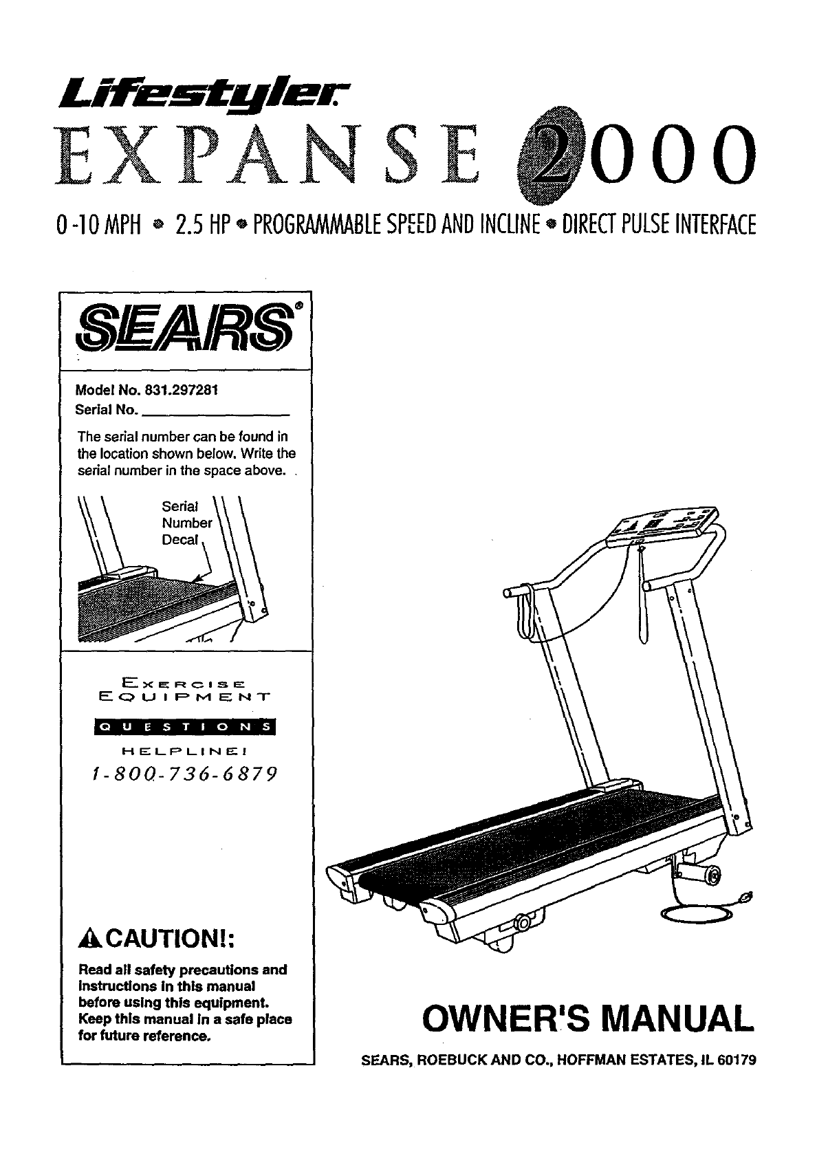 User Manual: Lifestyler 831297281 831297281 LIFESTYLER EXPANSE 2000 TREADMILL - Manuals and Guides View the owners manual for your LIFESTYLER EXPANSE 2000 TREADMILL #831297281. Home:Fitness Equipment Parts:Lifestyler Parts:Lifestyler EXPANSE 2000 TREADMILL Manual