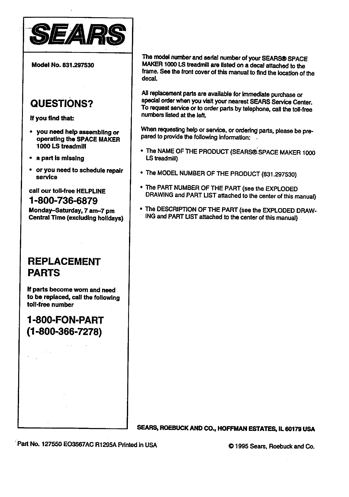 'Part No. 127550 EO3567AC R1295A Printed in USA ©1995 Sears, Roebuck and Co.