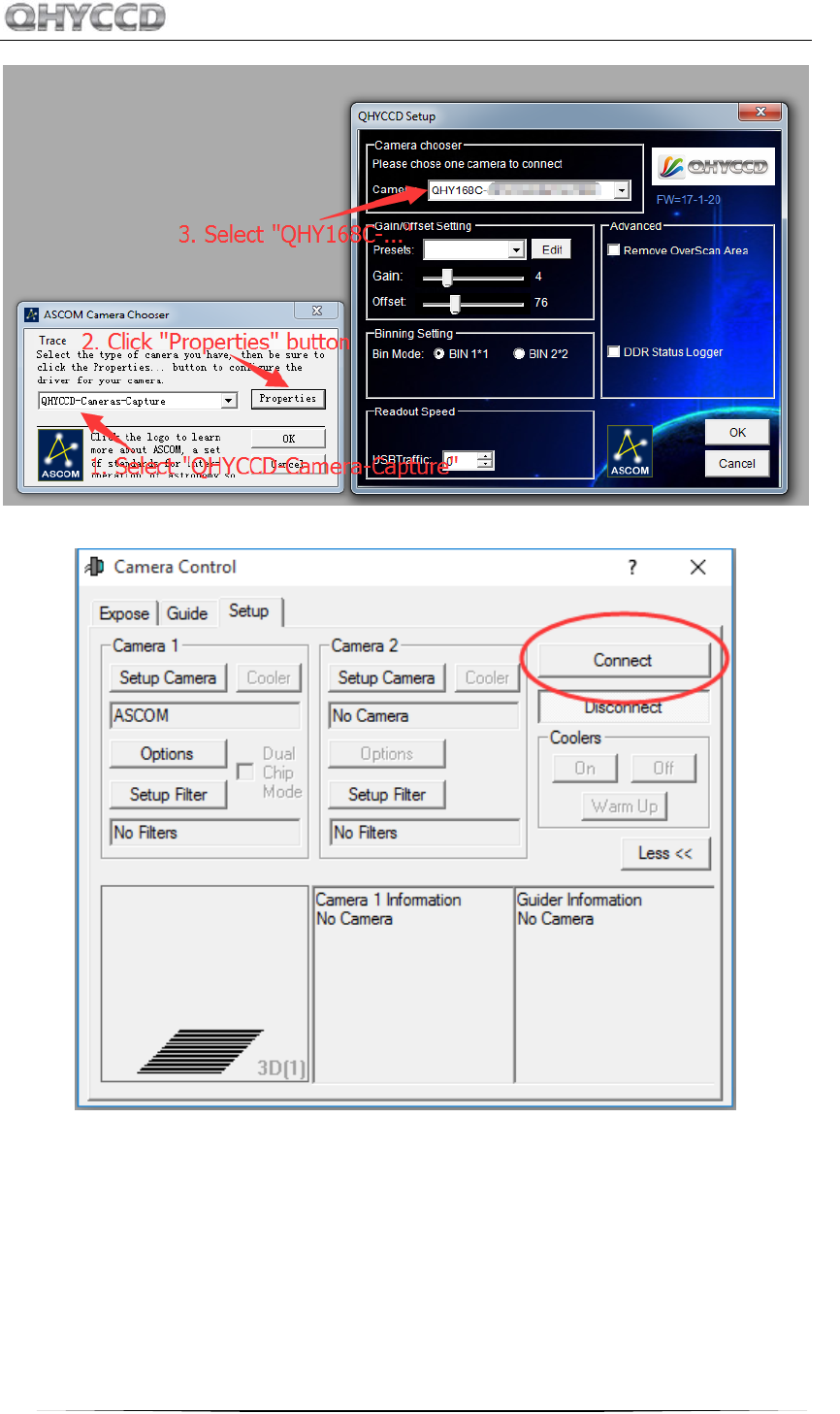 1. Connect QHY168C to 12V power supply. Connect QHY168C to your PC with USB3.0 cable.