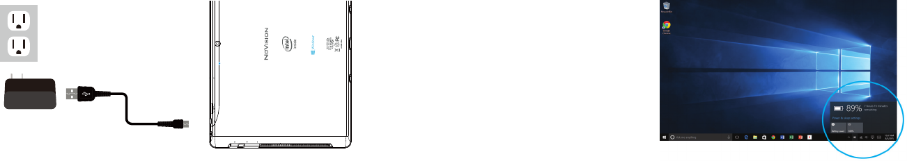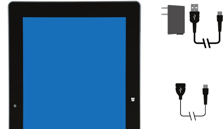 Connect the power adapter to a wall outlet, then to the tablet’s microUSB port as shown.