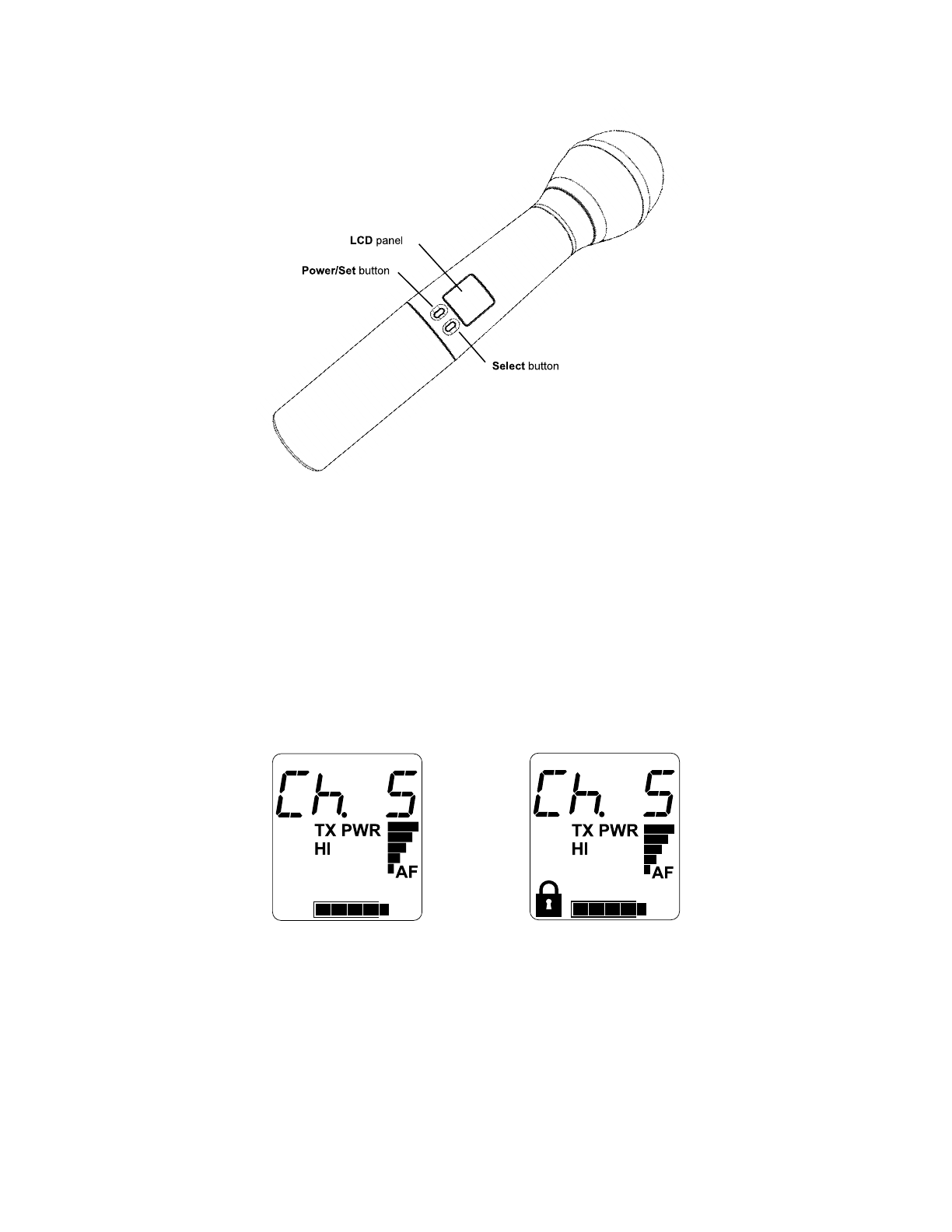 Power On, RF, Channel, Diversity, Battery Life, Audio Level Meter, Power On/Off, Channel