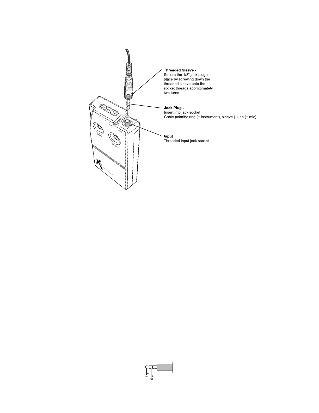 1/8" TRS locking connector, ring (+, instrument), sleeve (ground), tip (+, mic)