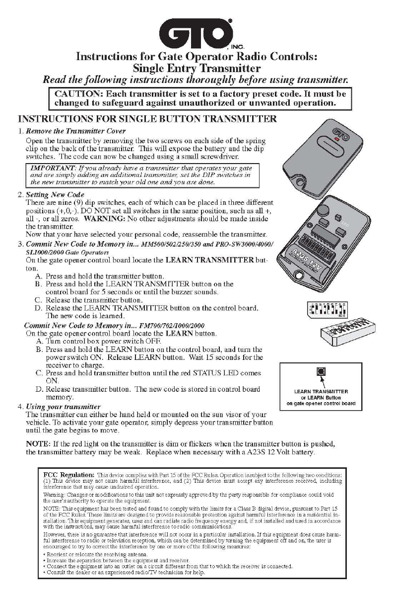 Linear Electronics LINEARRB741 Gate Opener Transmitter User Manual ID F07115 F0708