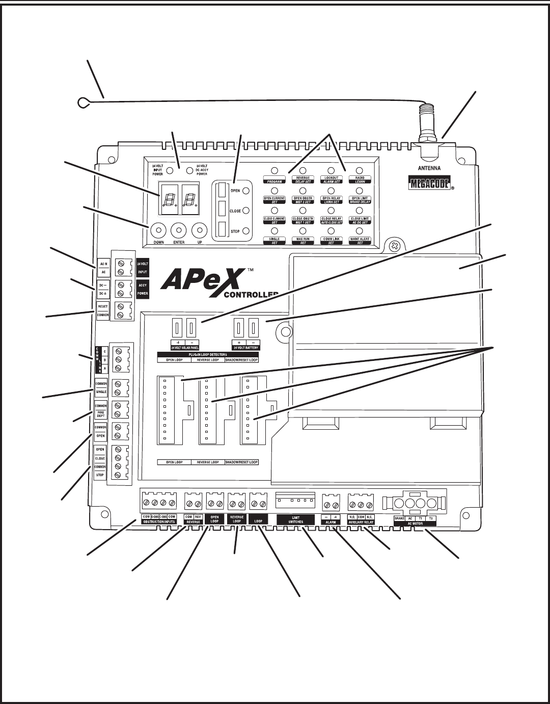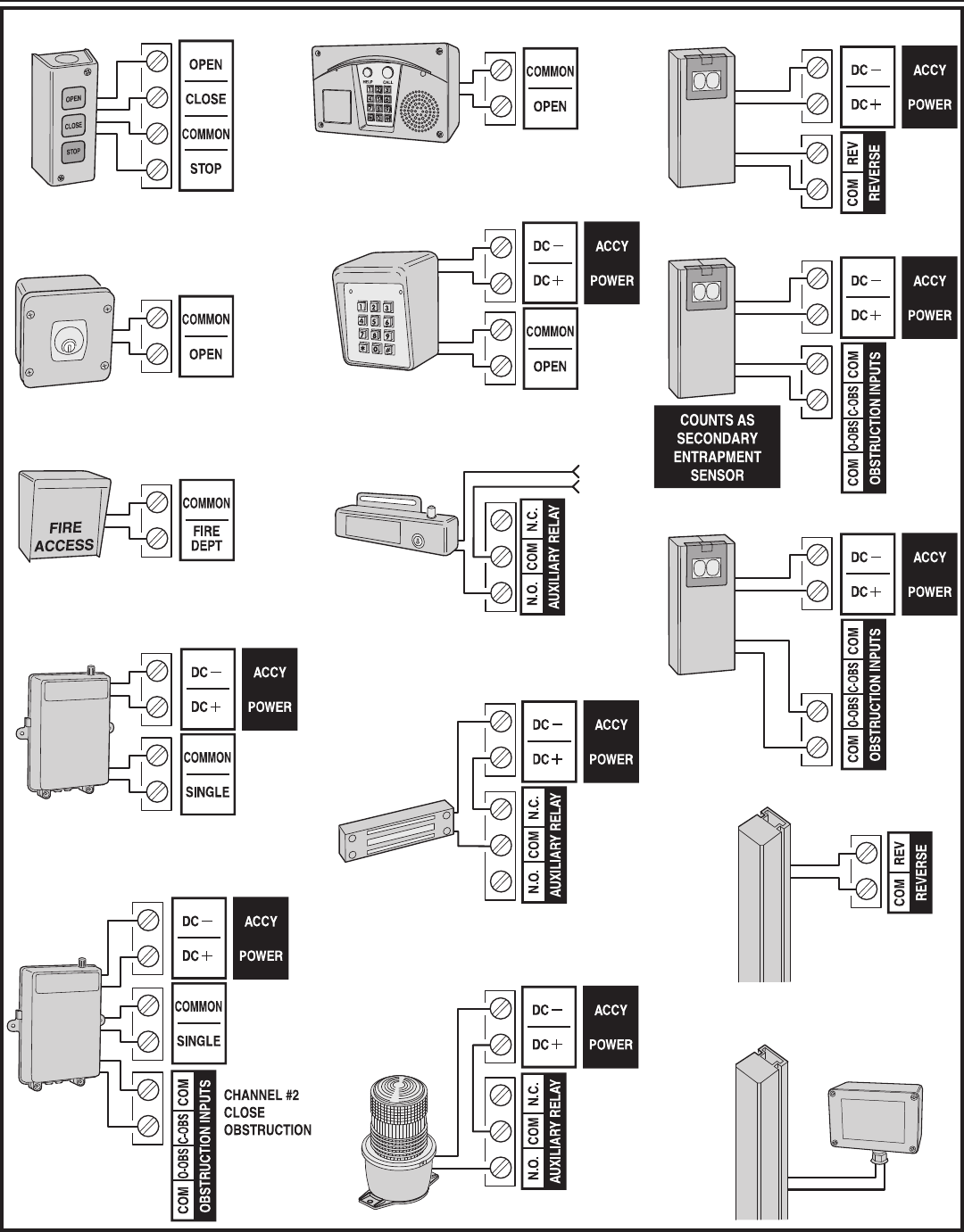 all of the operational functions, obstruction sensing devices, warning beeper and reset, etc.