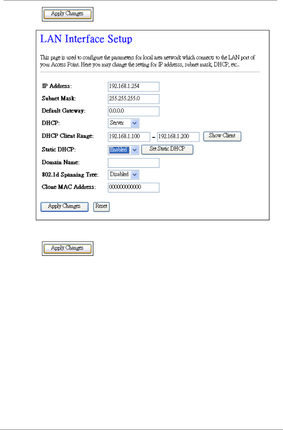 “255.255.255.0”, Default Gateway “0.0.0.0”, enable DHCP Server, DHCP client range “192.168.1.100”