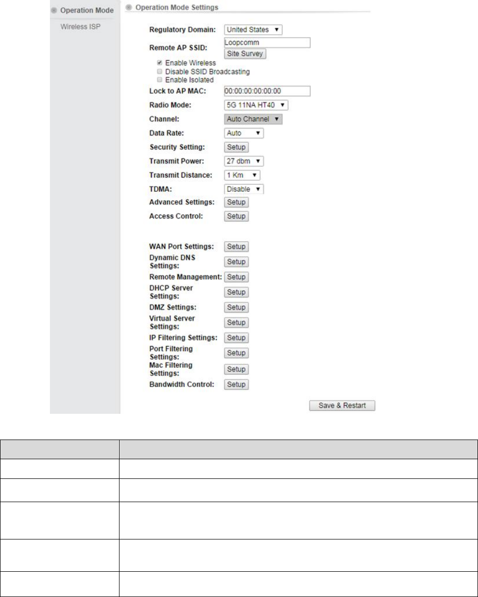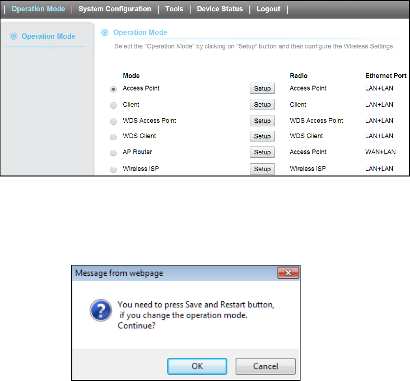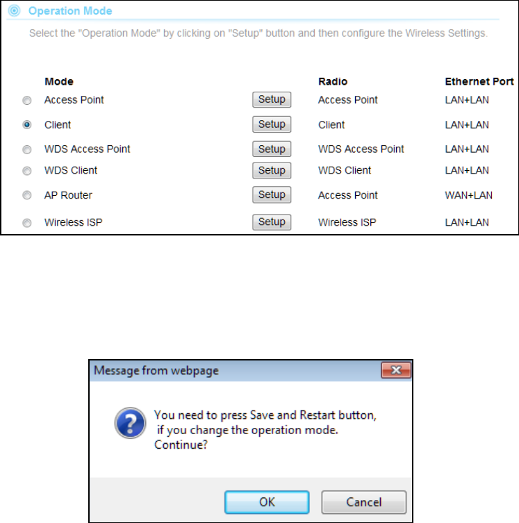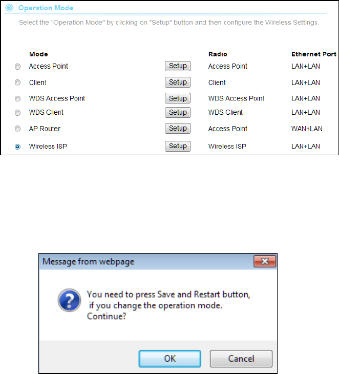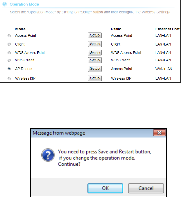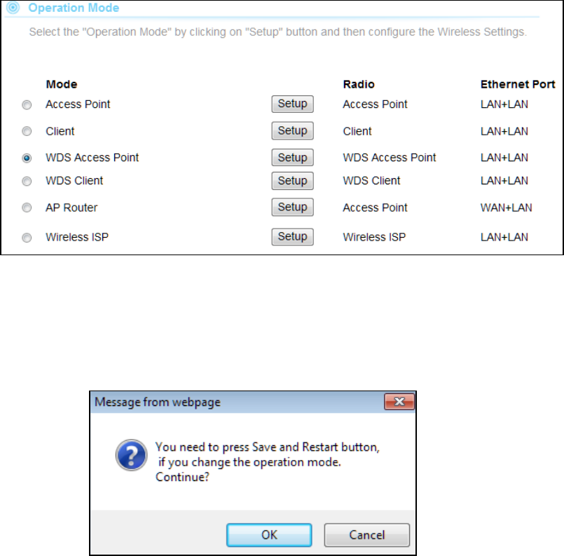 Operation Mode: Access Point/Client/WDS Access Point/WDS Client/AP Router/Wireless ISP