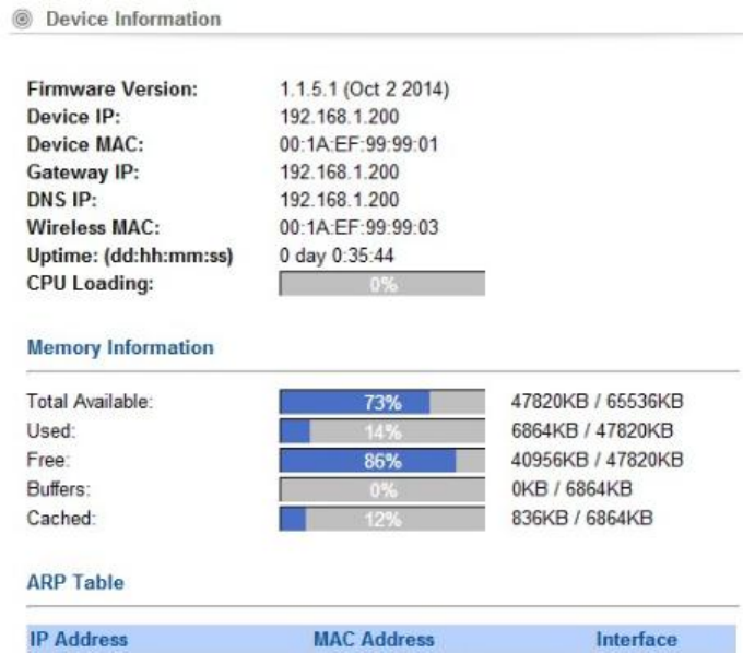 It presents the status of LP-2596K Firmware devices, memory utilization and ARP Table.