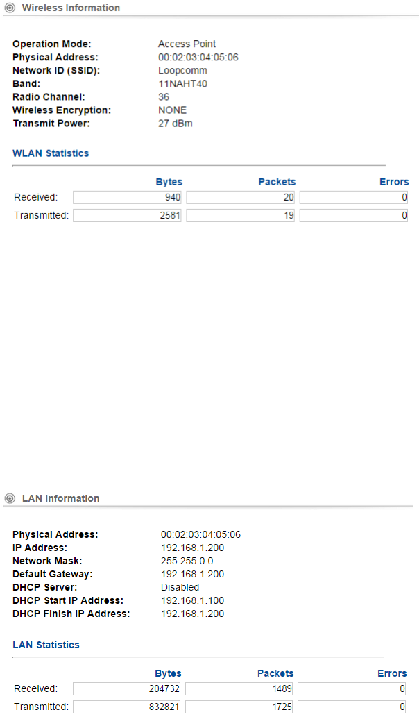 This page shows the wireless information of LP- 2596K device, such as current operation mode,
