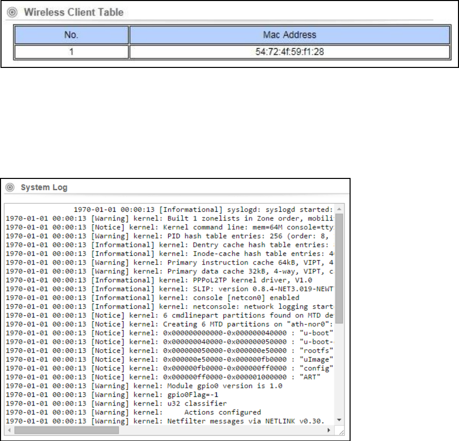 This page is used to view system logs. The System Log displays the system activities, login, and