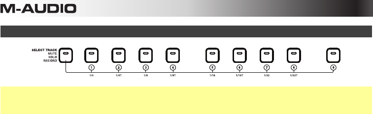 the eight track(s) of the current bank (outlined in blue). The currently selected fader buttons will be lit