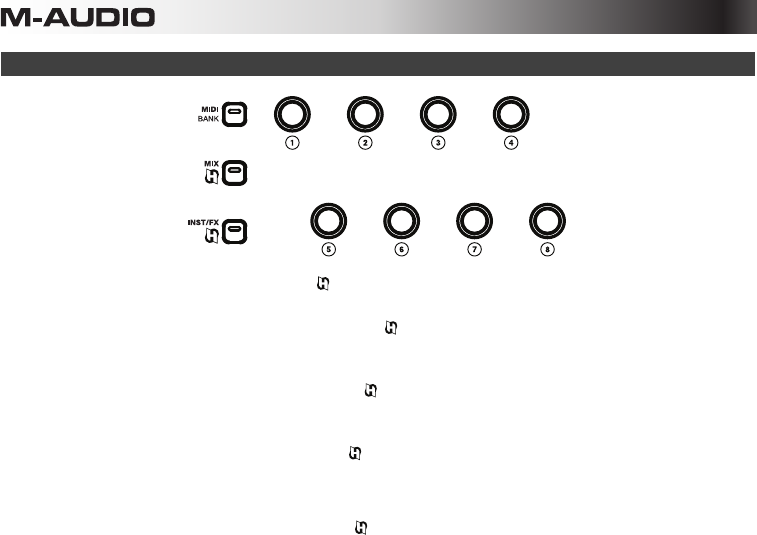 • Pan: In this mode, the knobs and Mix button will be lit green. The eight knobs will control the