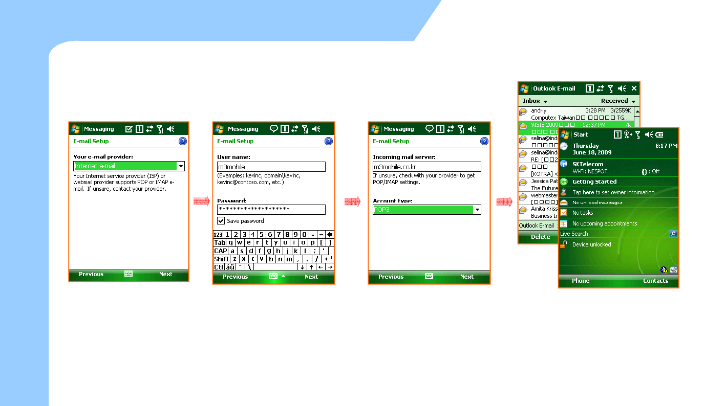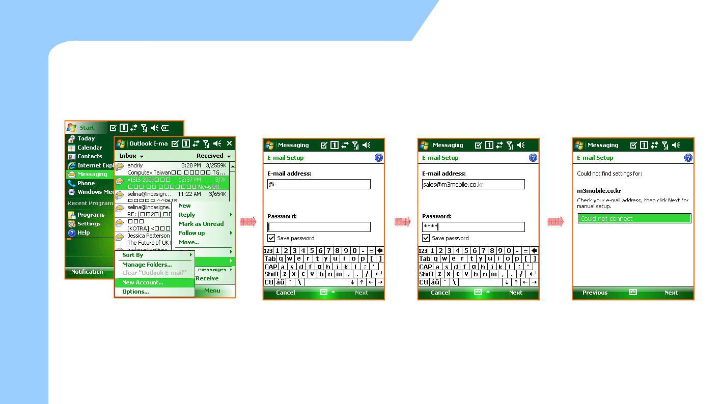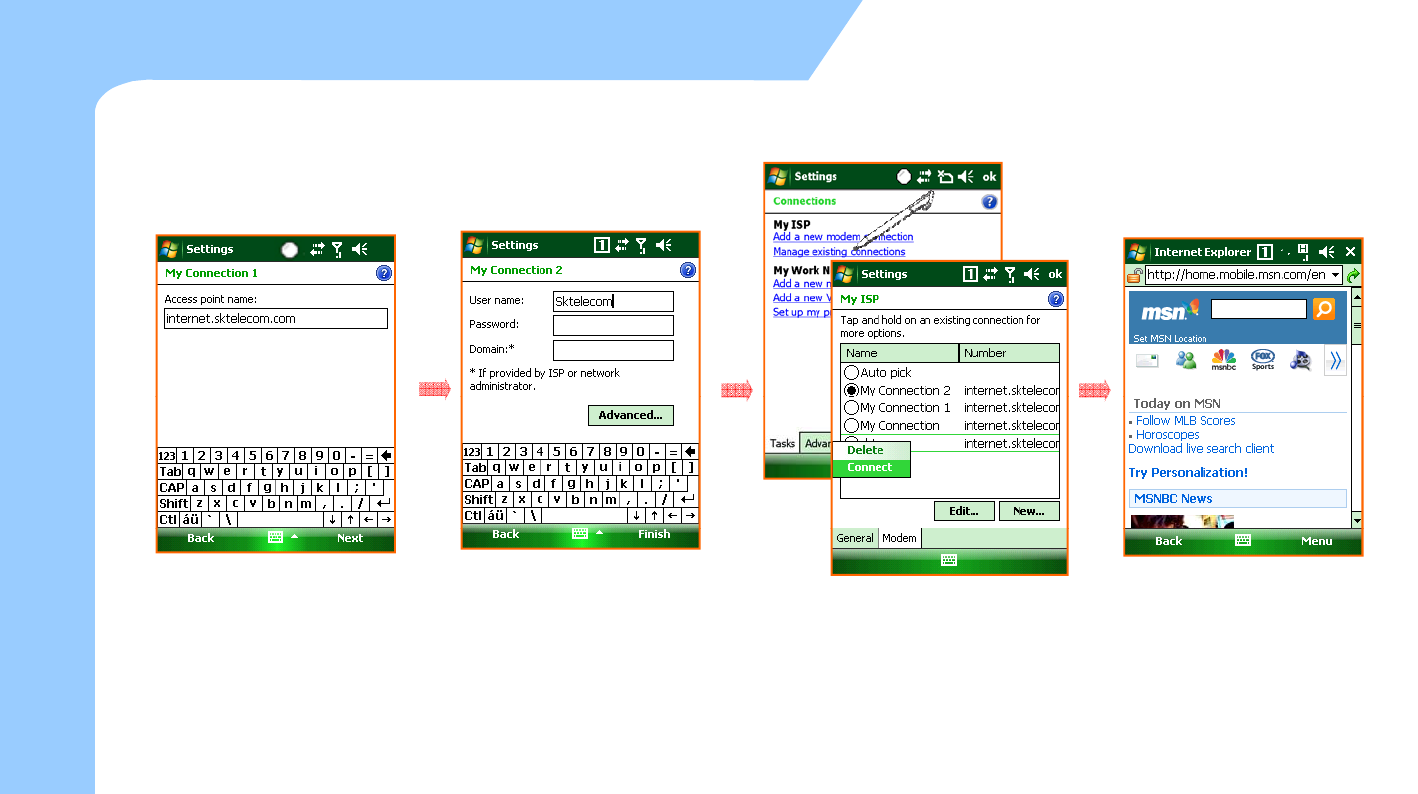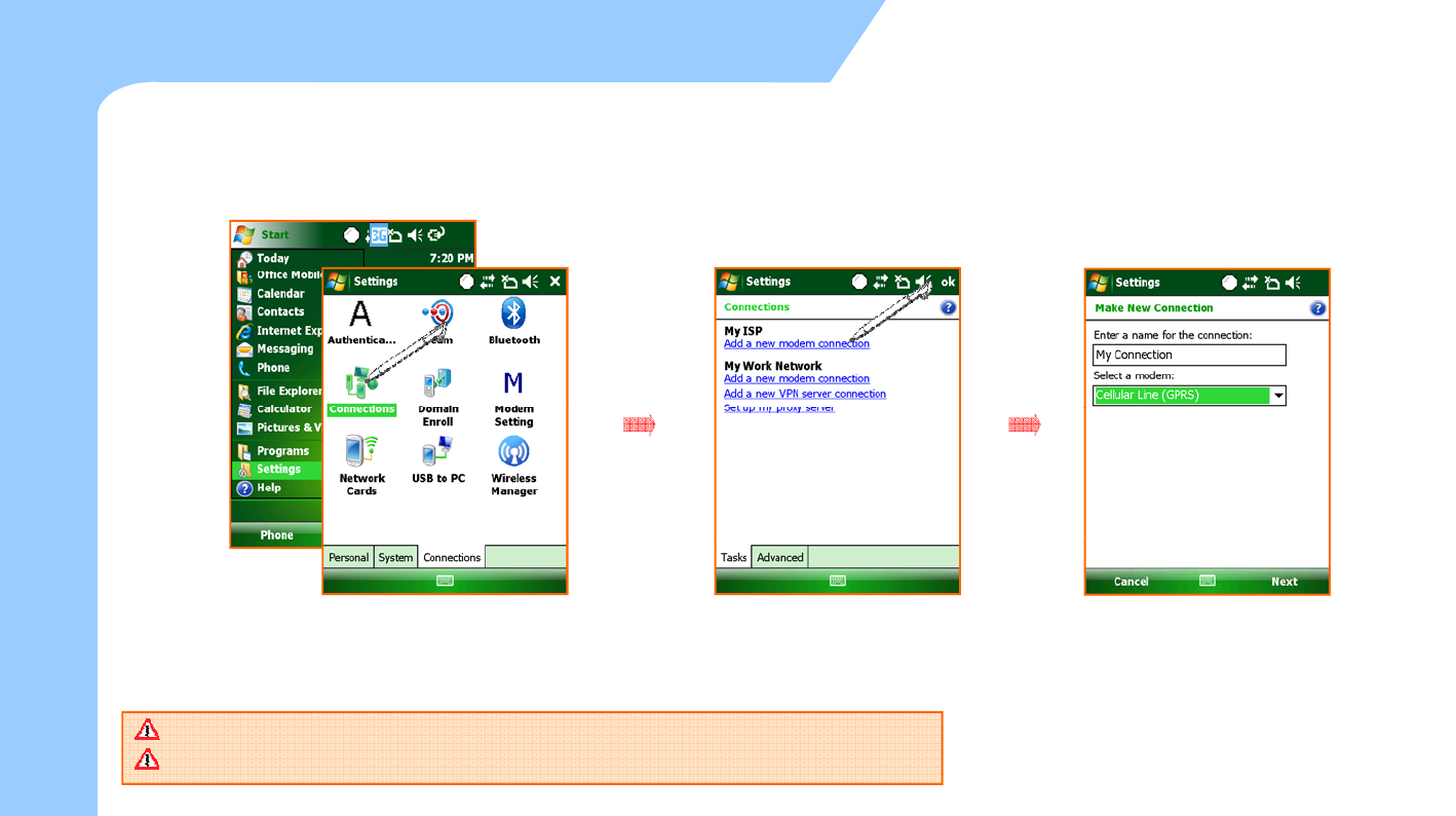 Tab ‘Start > Settings > Connections’ Select ‘Add a new modem connection’