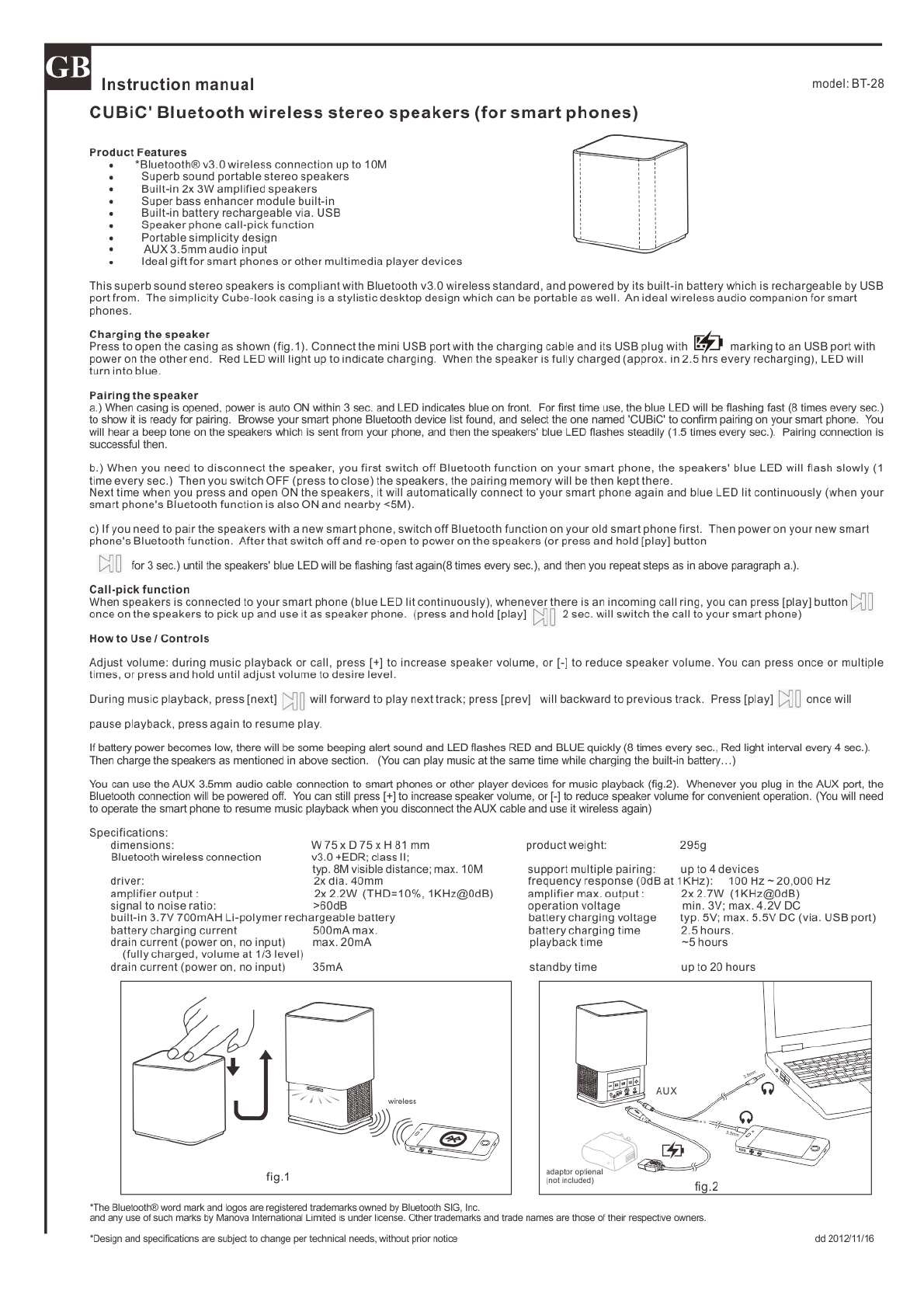 MANOVA MANOVA-BT-28 "CUBIC" BLUETOOTH STEREO SPEAKER User Manual