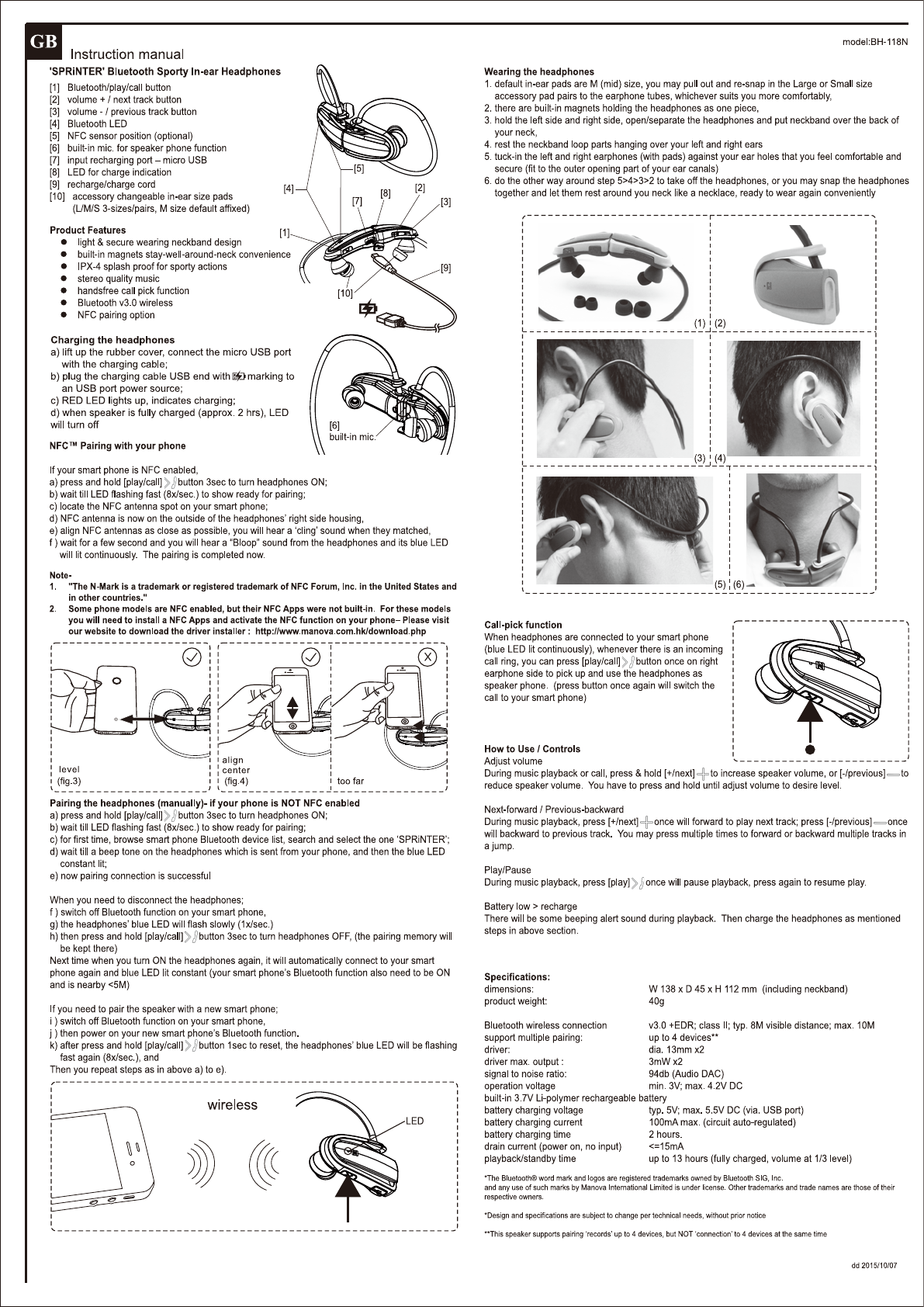 MANOVA MANOVABH118 SPRiNTER - Sporty Bluetooth In-ear Headphones User Manual