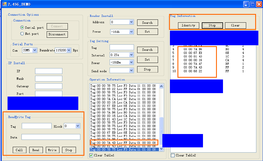 2.45GDemo.exe is supplied to show the communication between reader and tags
