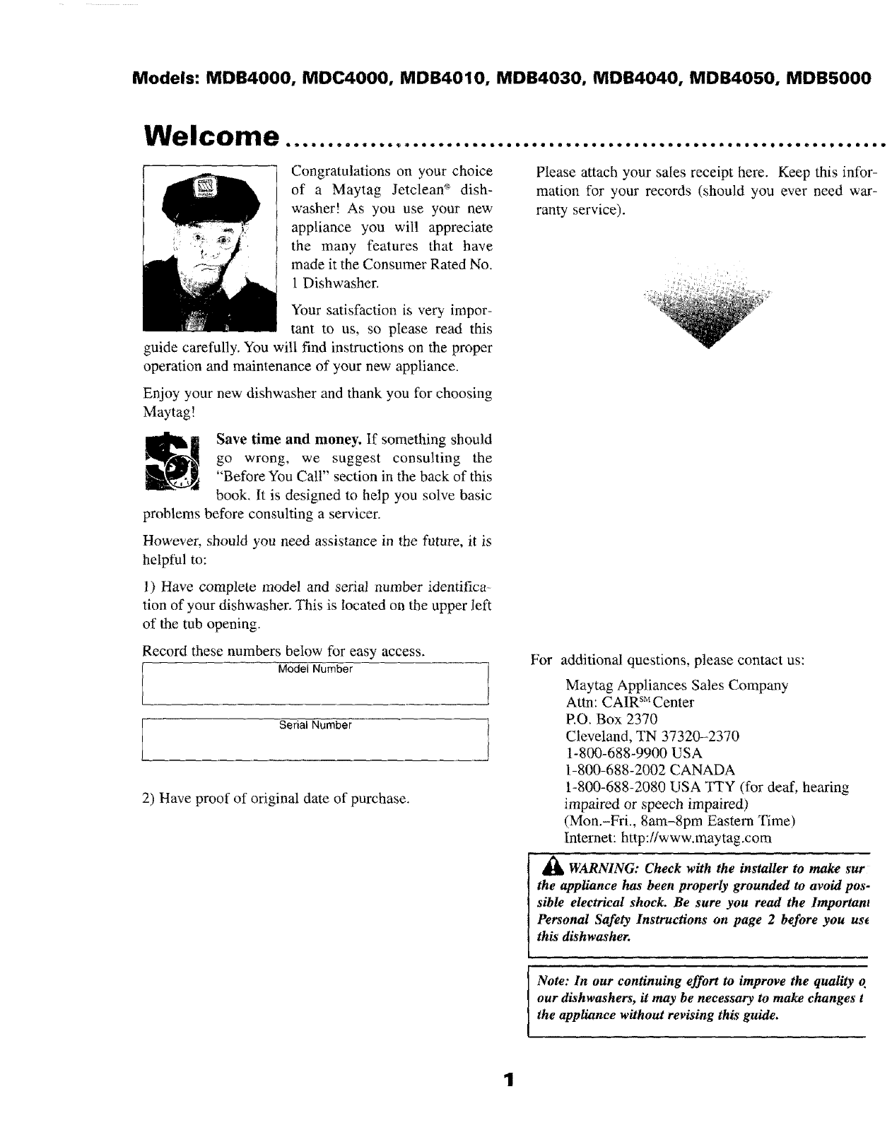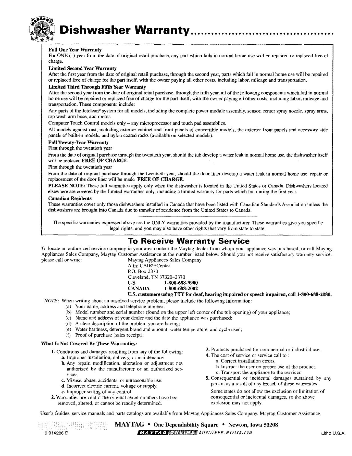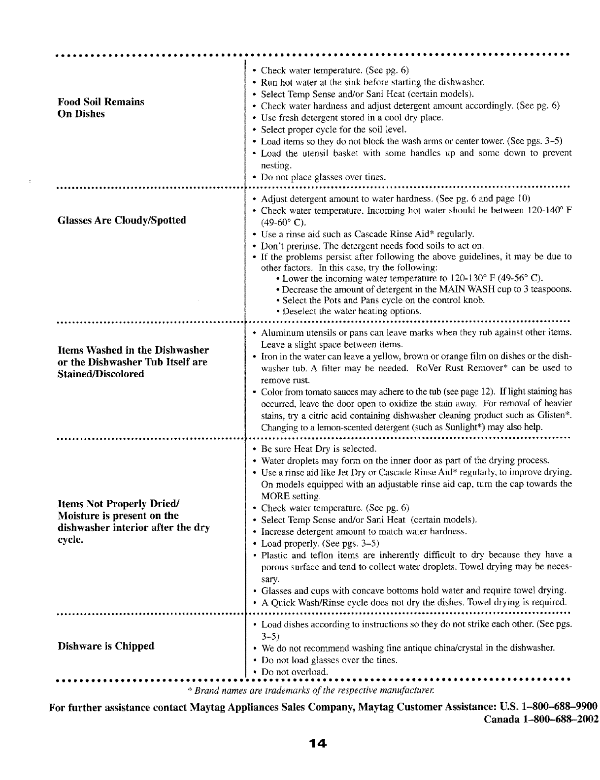 For further assistance contact Maytag Appliances Sales Company, Maytag Customer Assistance: U.S. 1-800--688-9900