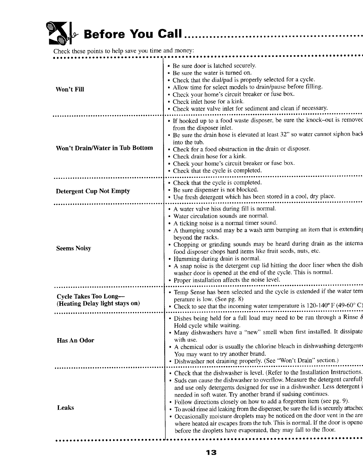 "Before You Call" section in the back of this