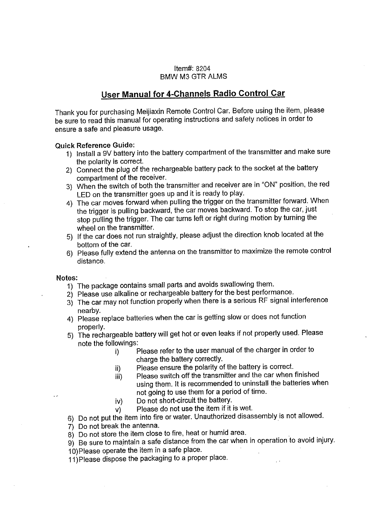 MEIJIAXIN TOYS 8204A RC Car User Manual