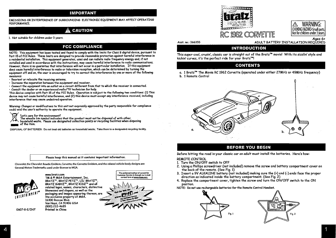MGA Entertainment 366898 Bratz The Movie RC 1962 Corvette - 49MHz User Manual Page 1