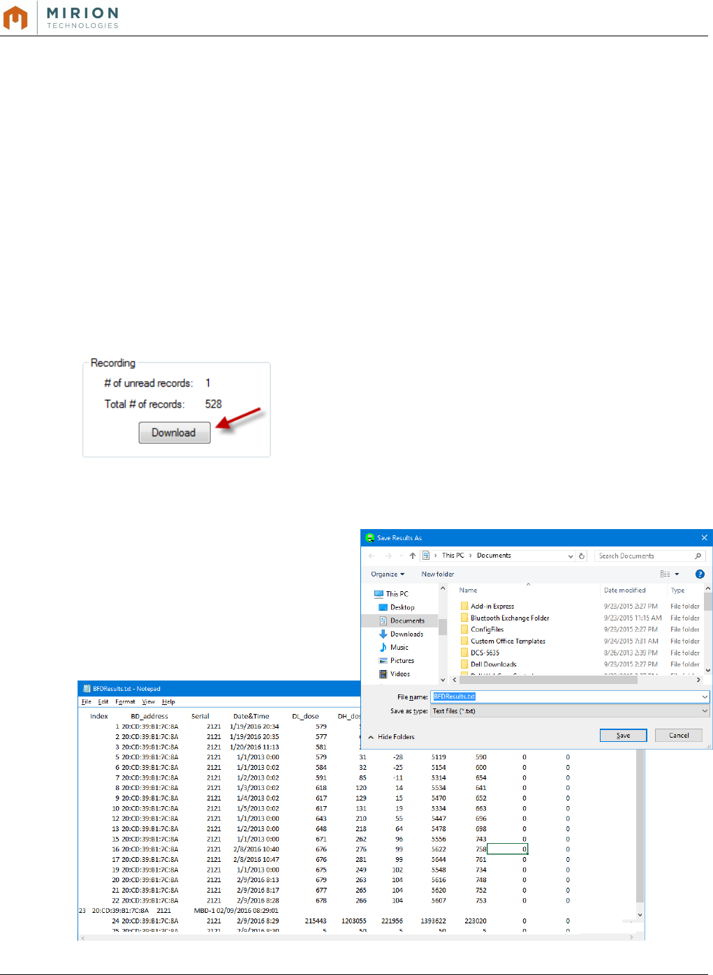The MBD-1 also stores a dose record once per day (default) to a nonvolatile memory. Data recording is