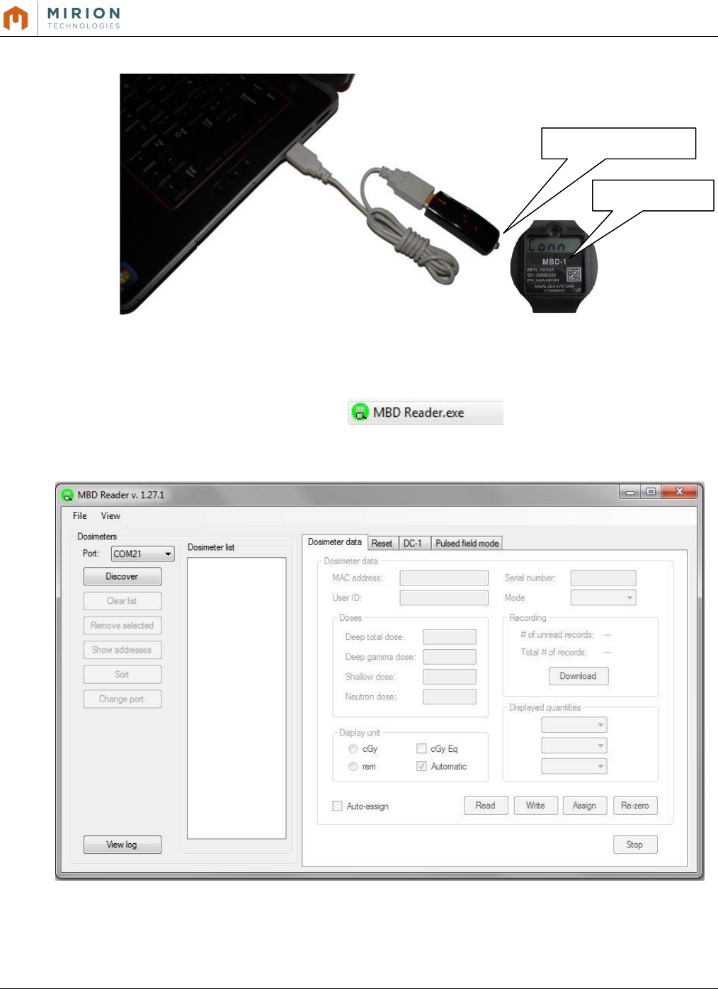 o Place an MBD-1 dosimeter between 4” – 6” from the IR/BLE Dongle (display facing