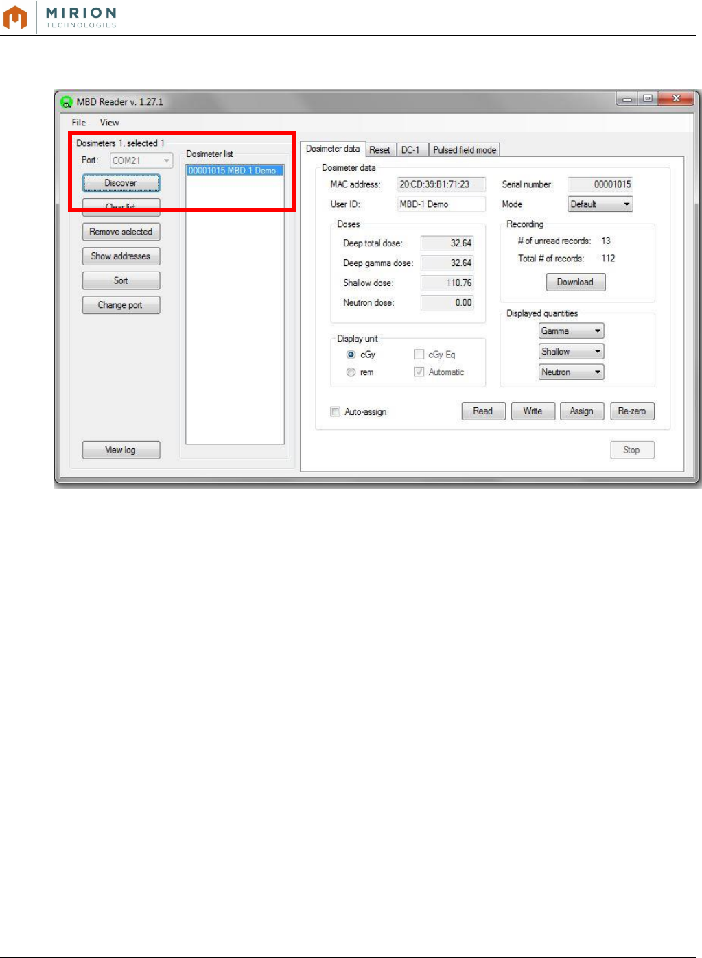 o The MBD Reader Dosimeter list will populate the available MBD-1 dosimeter(s)