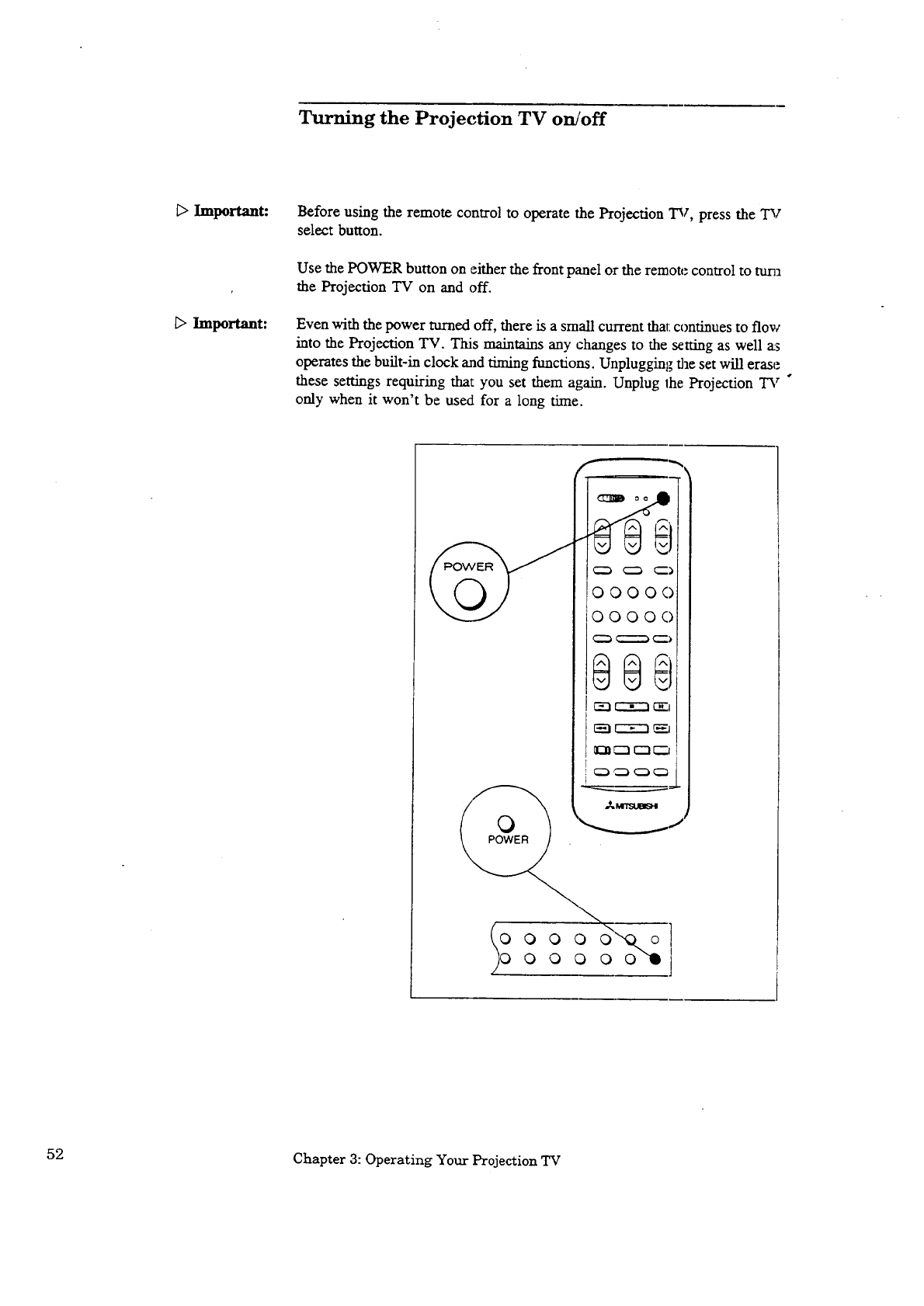 Turning the Projection TV on/off .............................. 52