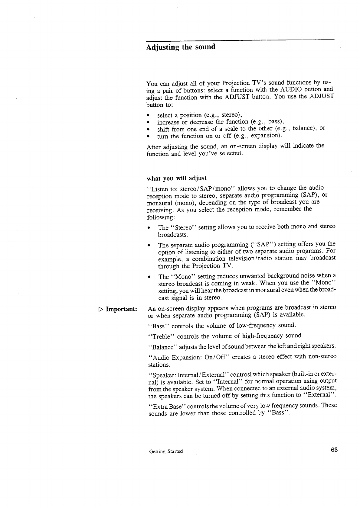 Adjusting the sound .......................................... 63